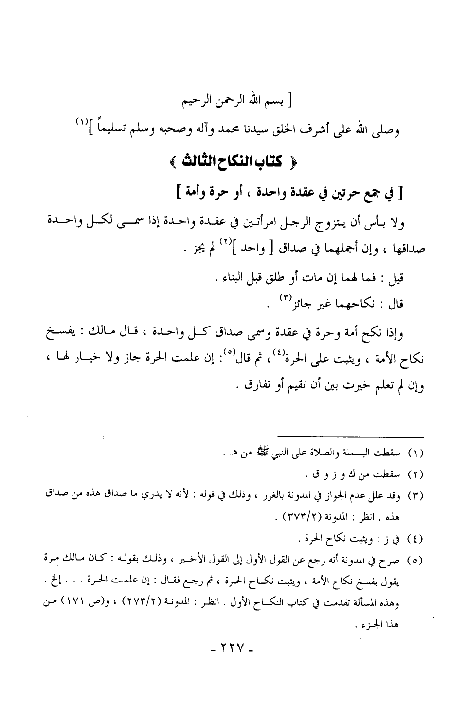 1479 - ولابأس أن يتزوج الرجل امرأتين في عقدة واحدة إذا سمى لكل واحدة صداقها، وإن أجملهما في صداق [واحد] لم يجز. قيل: فما لهما إن مات أو طلق قبل البناء. قال: نكاحهما غير جائز.