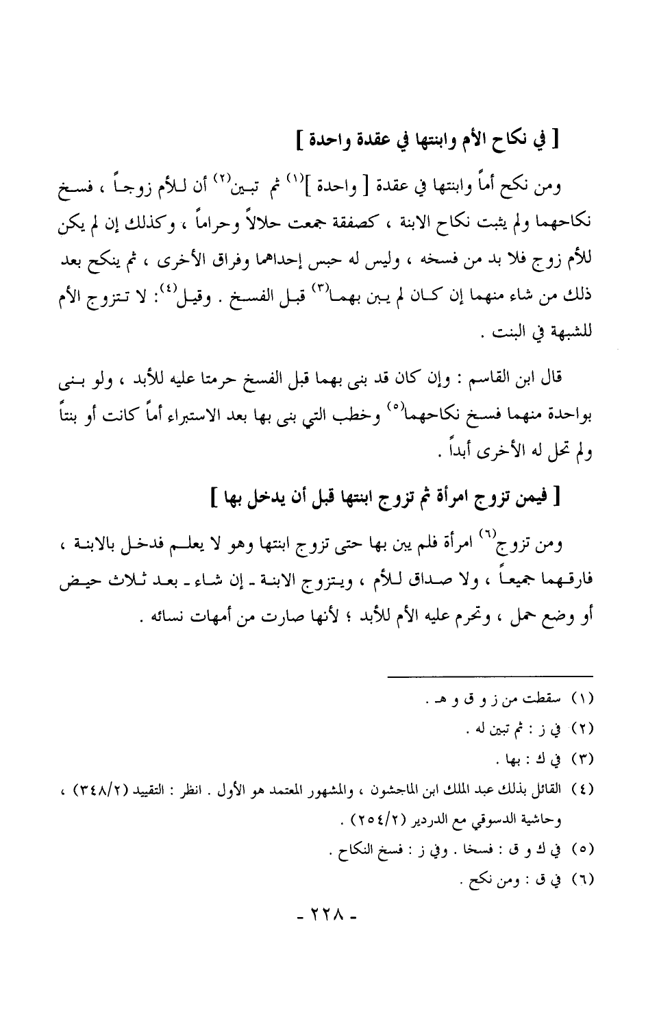 1481 - ومن نكح أماً وابنتها في عقدة [واحدة] ثم تبين أن للأم زوجاً، فسخ نكاحهما ولم يثبت نكاح الابنة، كصفقة جمعت حلالاً وحراماً، وكذلك إن لم يكن للأم زوج فلا بد من فسخه، وليس له حبس إحداهما وفراق الأخرى، ثم ينكح بعد ذلك من شاء منهما إن كان لم يبن بهما قبل الفسخ. وقيل: لا تتزوج الأم للشبهة في البنت.
