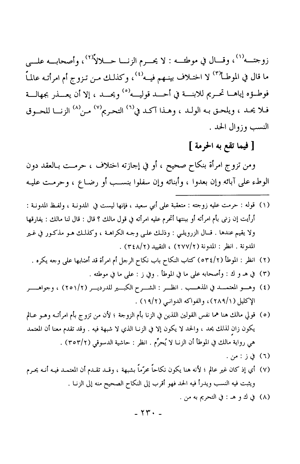 زوجته، وقال في موطئه: لا يحرم الزنا حلالاً، وأصحابه على ما قال في الموطأ لا اختلاف بينهم فيه، وكذلك من تزوج أم امرأته عالماً فوطؤه إياها تحريم للابنة في أحد قوليه ويحد، إلا أن يعذر بجهالة فلا يحد، ويلحق به الولد، وهذا أكد في التحريم من الزنا للحوق النسب وزوال الحد.
