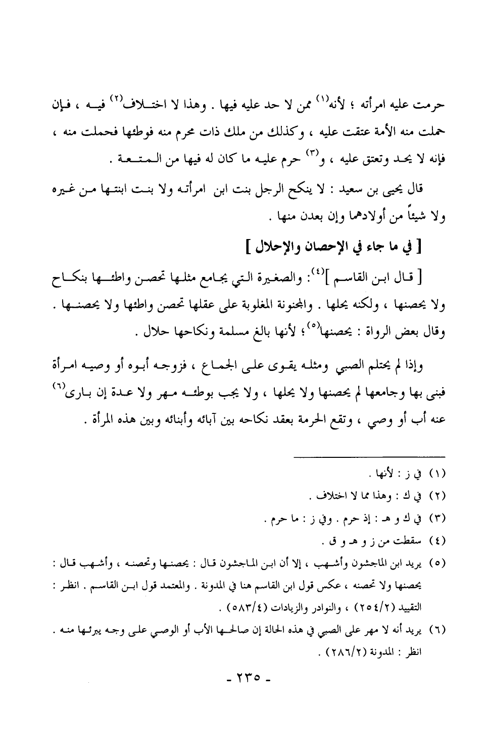 1497 -[قال ابن القاسم] : والصغيرة التي يجامع مثلها تحصن واطئها بنكاح ولا يحصنها، ولكنه يحلها. والمجنونة المغلوبة على عقلها تحصن واطئها ولا يحصنها. وقال بعض الرواة: يحصنها، لأنها بالغ مسلمة ونكاحها حلال.