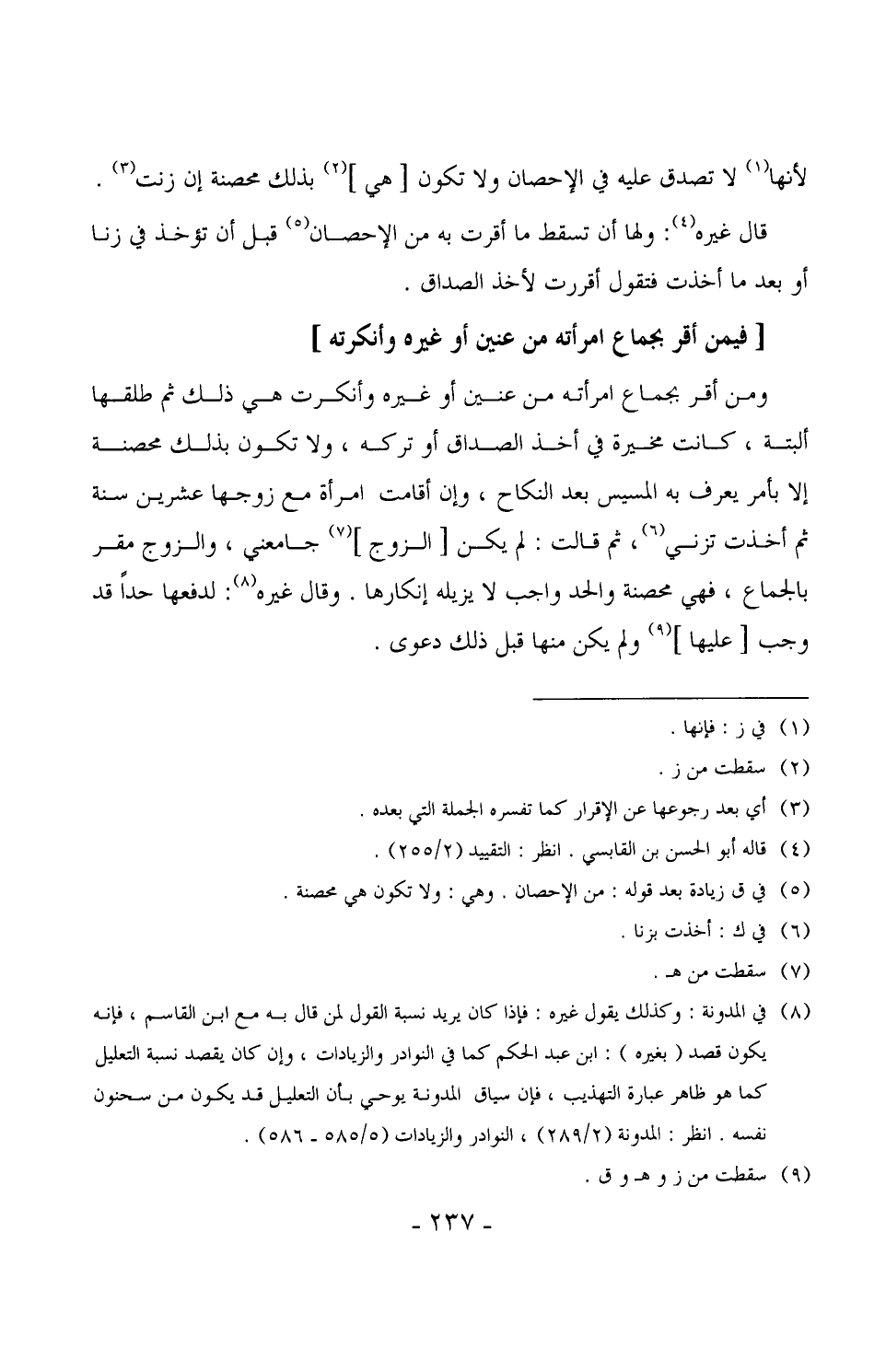 1499 - ومن أقر بجماع امرأته من عنين أو غيره وأنكرت هي ذلك ثم طلقها ألبتة، كانت مخيرة في أخذ الصداق أو تركه، ولا تكون بذلك محصنة إلا بأمر يعرف به المسيس بعد النكاح، وإن أقامت امرأة مع زوجها عشرين سنة ثم أخذت تزني، ثم قالت: لم يكن [الزوج] جامعني، والزوج مقر بالجماع، فهي محثنة والحد واجب لا يزيله إنكارها. وقال غيره: لدفعها حداً قد وجب [عليها] ولم يكن منها قبل ذلك دعوى.