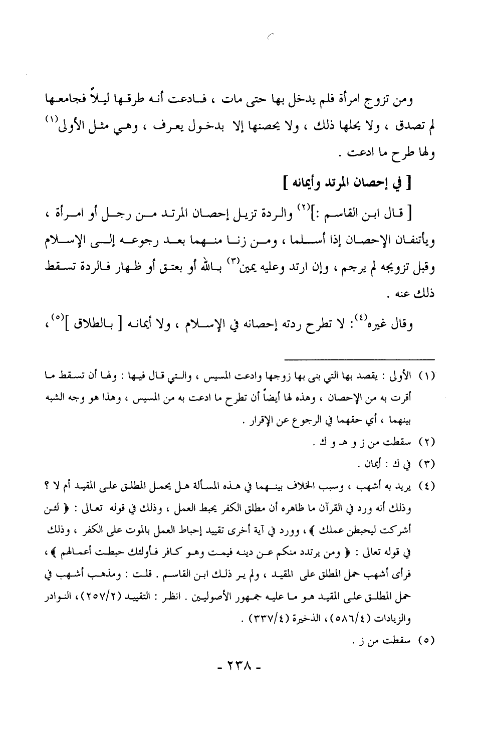 1501 -[قال ابن القاسم:] والردة تزيل إحصان المرتد من رجل أو امرأة، ويأتنفان الإحصان إذا أسلما، ومن زنا منهما بعد رجوعه إلى الإسلام وقبل تزويجه لم يرجم، وإن ارتد وعليه يمين بالله بعتق أو ظهار فالردة تسقط ذلك عنه.