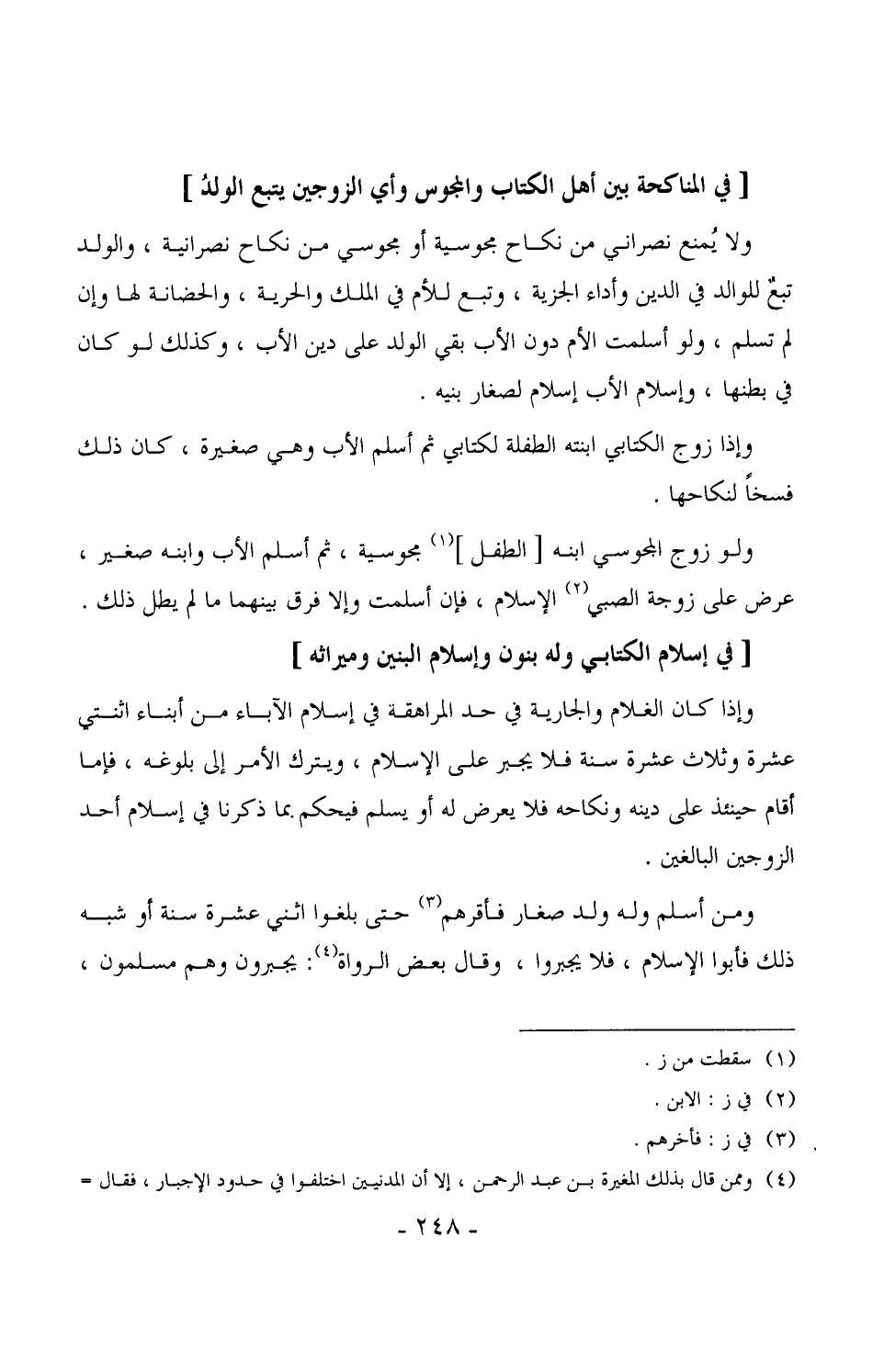 1515 - ولا يُمنع نصراني من نكاح مجوسية أو مجوسي من نكاح نصرانية، والولد تبع للوالد في الدين وأداء الجزية، وتبع للأم في الملك والحرية، والحضانة لها وإن لم تسلم ولو أسلمت الأم دون الأب بقي الولد على دين الأب، وكذلك لو كان في بطنها، وإسلام الأب إسلام لصغار بنيه.