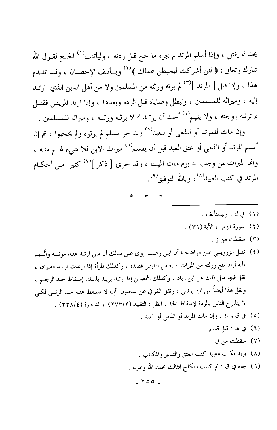 يحد ثم يقتل، وإذا أسلم المرتد لم يجزه ما حج قبل ردته، وليأتنف الحج لقول الله تبارك وتعالى: ×لَئِنْ أَشْرَكْتَ لَيَحْبَطَنَّ عَمَلُكَ% (الزمر: 65) ، ويأتنف الإحصان، وقد تقدم هذا، وإذا قتل [المرتد] لم يرثه ورثته من المسلمين ولا من أهل الدين الذي ارتد إليه، وميراثه للمسلمين، وتبطل وصاياه قبل الردة وبعدها، وإذا ارتد المريض فقتل لم ترثه زوجته، ولا يتهم أحد أن يرتد لئلا يرثه ورثته، وميراثه للمسلمين.