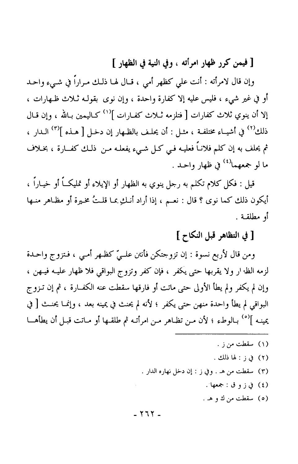 1552 - ومن قال لأربع نسوة: إن تزوجتكن فأنتن علي كظهر أمي، فتزوج واحدة لزمه الظهار ولا يقربها حتى يكفر، فإن كفر وتزوج البواقي فلا ظهار عليه فيهن، وإن لم يكفر ولم يطأ الأولى حتى ماتت أو فارقها سقطت عنه الكفارة، ثم إن تزوج البواقي لم يطأ واحدة منهن حتى يكفر، لأنه لم يحنث في يمينه بعد، وإنما يحنث [في يمينه] بالوطء، لأن من تظاهر من امرأته ثم طلقها أو ماتت قبل أن يطأها