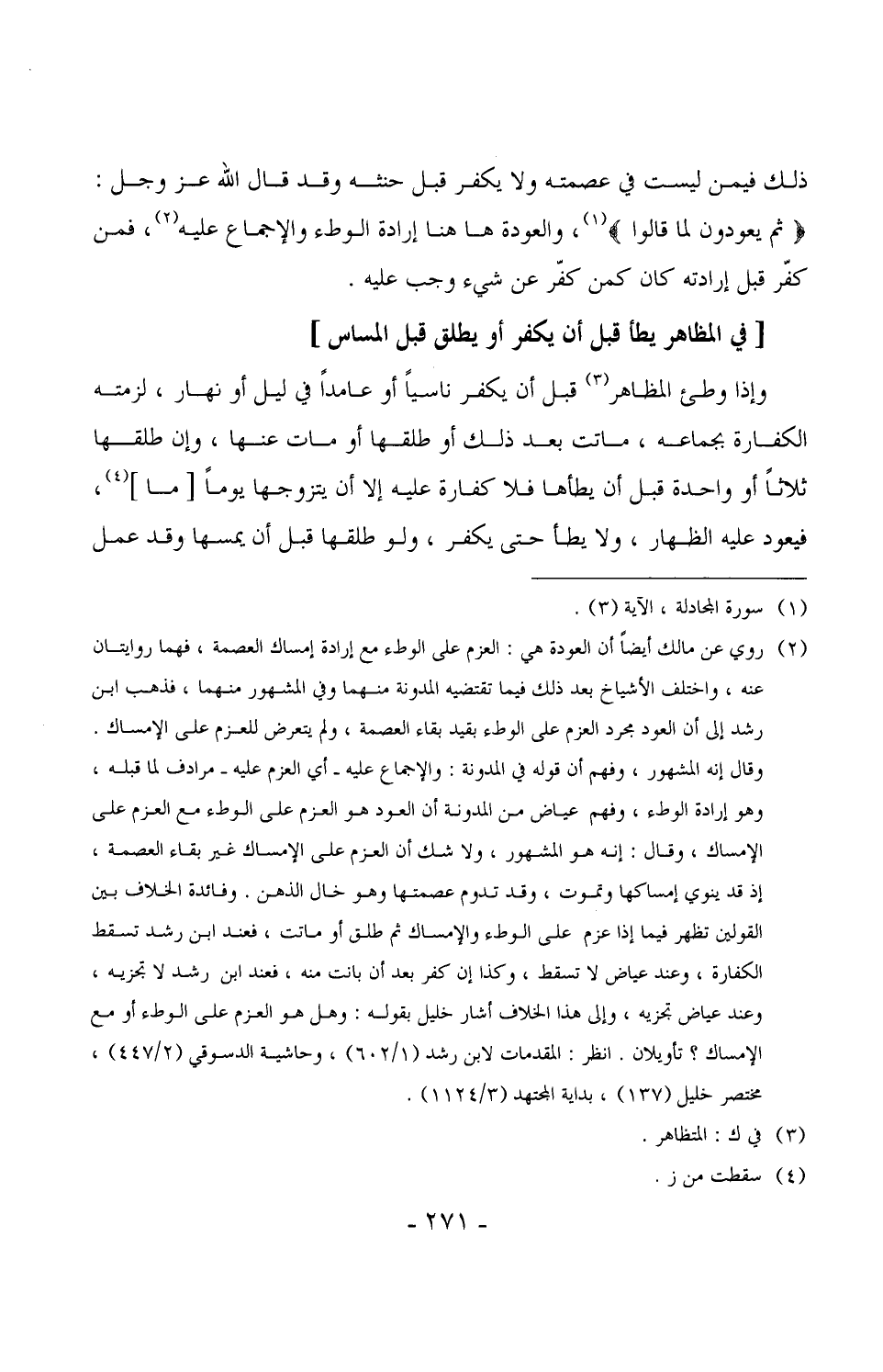 ذلك فيمن ليست في عصمته ولا يكفر قبل حنثه وقد قال الله عز وجل: ×ثُمَّ يَعُودُونَ لِمَا قَالُوا%، والعودة ها هنا إرادة الوطء والإجماع عليه، فمن كفّر قبل إرادته كان كمن كفّر عن شيء وجب عليه.