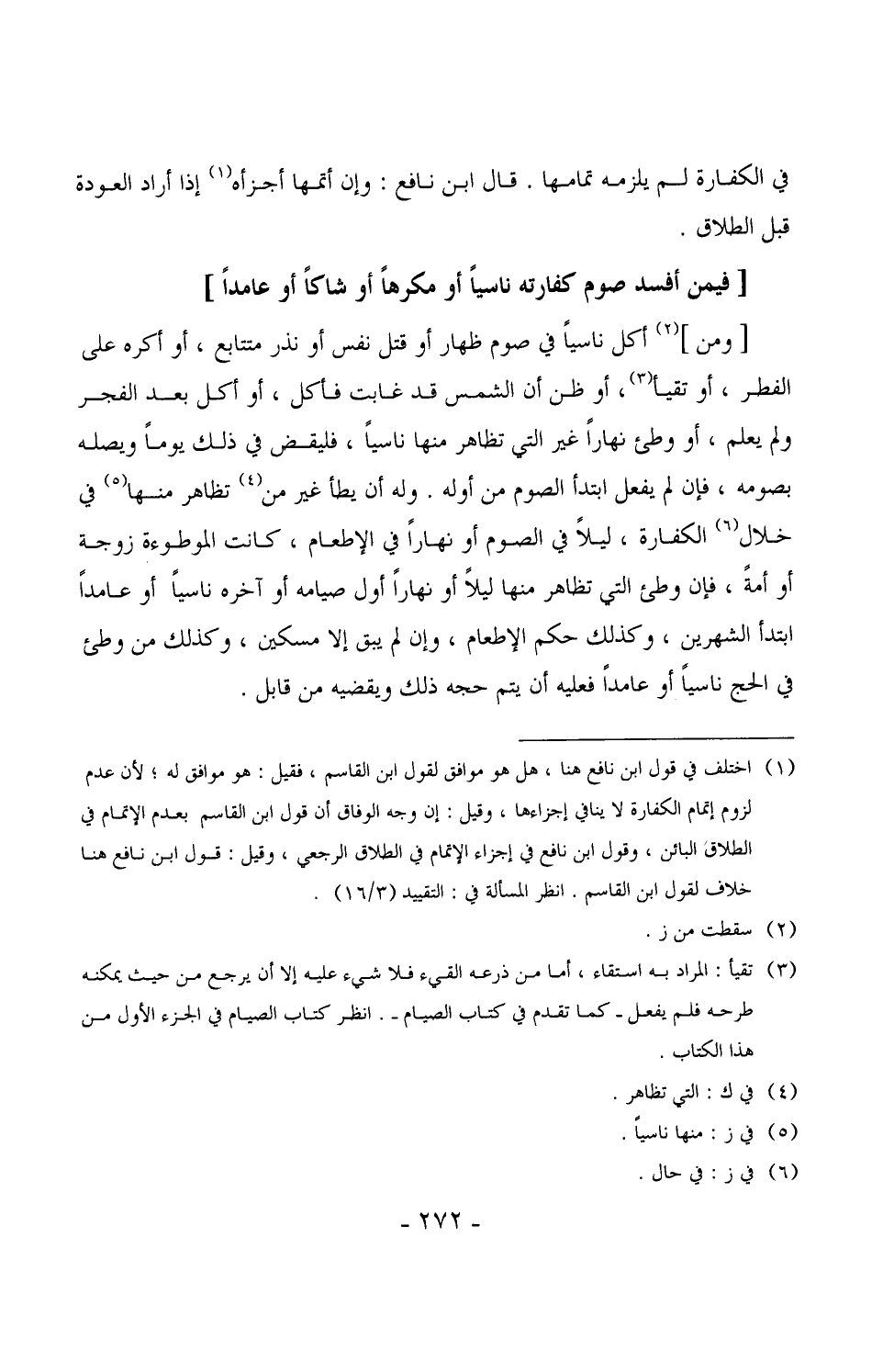 1567 -[ومن] أكل ناسياً في صوم ظهار أو قتل نفس أو نذر متتابع، أو أكره على الفطر، أو تقيأ، أو ظن أن الشمس قد غابت فأكل، أو أكل بعد الفجر ولم يعلم، أو وطئ نهاراً غير التي تظاهر منها ناسياً، فليقض في ذلك يوماً ويصله بصومه، فإن لم يفعل ابتدأ الصوم من أوله. وله أن يطأ غير من تظاهر منها في خلال الكفارة، ليلاً في الصوم أو نهاراً في الإطعام، كانت الموطوءة زوجة أو أمة، فإن وطئ التي تظاهر منها ليلاً أو نهاراً أول صيامه أو آخره ناسياً أو عامداً ابتدأ الشهرين، وكذلك حكم الإطعام، وإن لم يبق إلا مسكين، وكذلك من وطئ في الحج ناسياً أو عامداً فعليه أن يتم حجه ذلك ويقضيه من قابل.