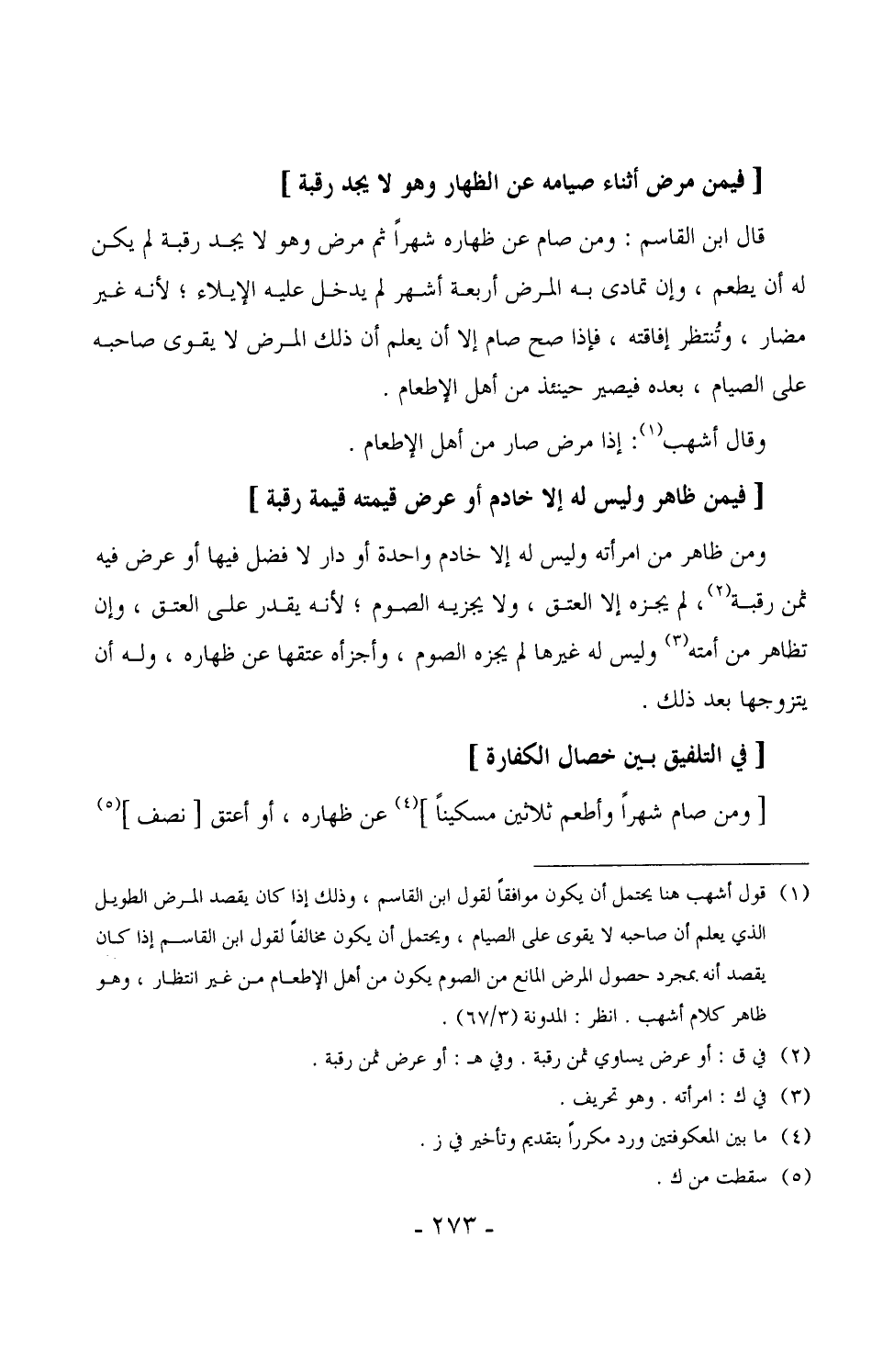 1568 - قال ابن القاسم: ومن صام عن ظهاره شهراً ثم مرض وهو لا يجد رقبة لم يكن له أن يطعم، وإن تمادى به المرض أربعة أشهر لم يدخل عليه الإيلاء، لأنه غير مضار، وتُنتظر إفاقته، فإذا صح صام إلا أن يعلم أن ذلك المرض لا يقوى صاحبه على الصيام، بعده فيصير حينئذ من أهل الإطعام.