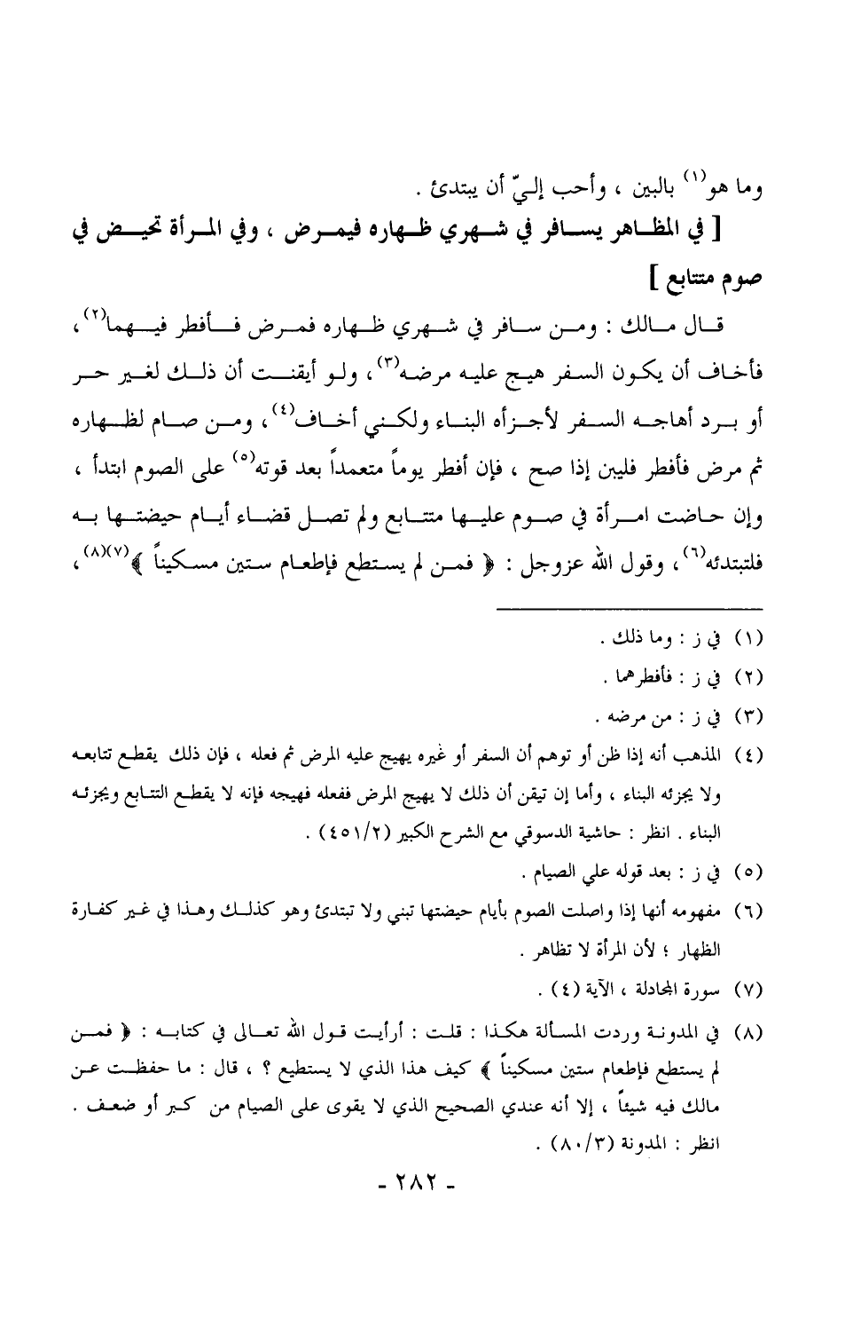 1582 - قال مالك: ومن سافر في شهري ظهاره فمرض فأفطر فيهما، فأخاف أن يكون السفر هيج عليه مرضه، ولو أيقنت أن ذلك لغير حر أو برد أهاجه السفر لجزأه البناء ولكني أخاف، ومن صام لظهاره ثم مرض فأفطر فليبن إذا صح، فإن أفطر يوماً متعمداً بعد قوته على الصوم ابتدأ، وإن حاضت امرأة في صوم عليها متتابع ولم تصل قضاء أيام حيضتها به فلتبتدئه، وقول الله عز وجل: ×فَمَن لَّمْ يَسْتَطِعْ فَإِطْعَامُ سِتِّينَ مِسْكِينًا%،