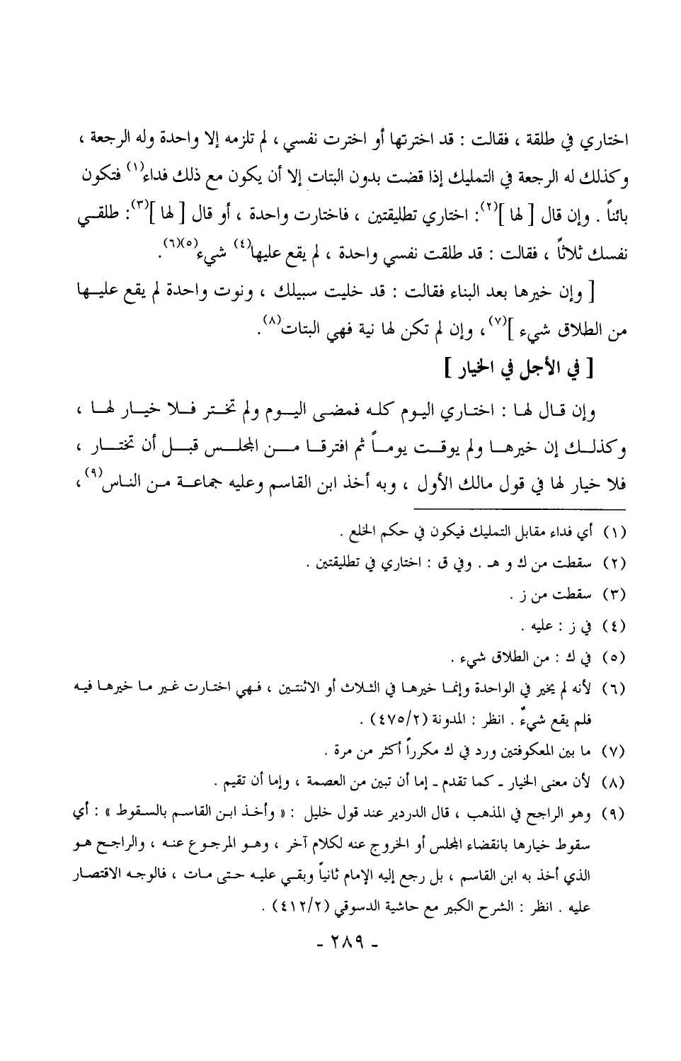 1588 - وإن قال لها: اختاري اليوم كله فمضى اليوم ولم تختر فلا خيار لها، وكذلك إن خيرها ولم يوقت يوماً ثم افترقا من المجلس قبل أن تختار، فلا خيار لها في قول مالك الأول، وبه أخذ ابن القاسم وعليه جماعة من الناس،