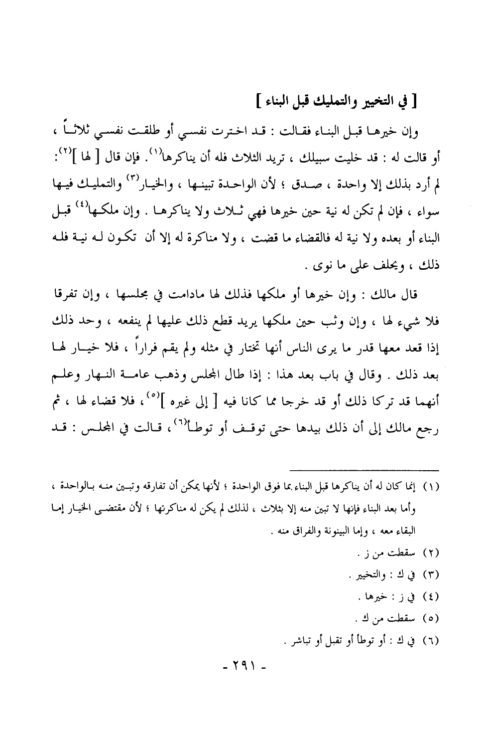 1592 - وإن خيرها قبل البناء فقالت: قد اخترت نفسي أو طلقت نفسي ثلاثاً، أو قالت له: قد خليت سبيلك، تريد الثلاث فله أن يناكرها. فإن قال [لها] : لم أرد بذلك إلا واحدة، صدق، لأن الواحدة تبينها، والخيار والتمليك فيها سواء، فإن لم تكن له نية حين خيرها فهي ثلاث ولا يناكرها. وإن ملكها قبل البناء أو بعده ولا نية فالقضاء ما قضت، ولا مناكرة له إلا أن تكون له نية فله ذلك، ويحلف على ما نوى.