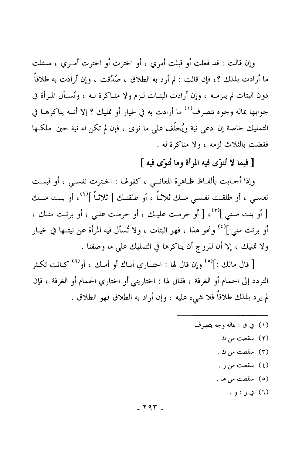 وإن قالت: قد فعلت أو قبلت أمري، أو اخترت أو اخترت أمري، سئلت ما أرادت بذلك؟، فإن قالت: لم أرد به الطلاق، صُدّقت، وإن أرادت به طلاقاً دون البتات لم يلزمه، وإن أرادت البتات لزم ولا مناكرة له، وتُسأل المرأة في جوابها بماله وجوه تتصرف ما أرادت به في خيار أو تمليك؟ إلا أنه يناكرها في التمليك خاصة إن ادعى نية ويُحلّف على ما نوى، فإن لم تكن له نية حين ملكها فقضت بالثلاث لزمه، ولا مناكرة له.