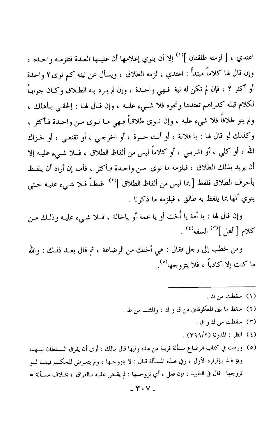 اعتدي، [لزمته طلقتان] إلا أن ينوي إعلامها أن عليها العدة فتلزمه واحدة، وإن قال لها كلاماً مبتدأ: اعتدي، لزمه الطلاق، ويسأل عن نيته كم نوى؟ واحدة أو أكثر؟، فإن لم تكن له نية فهي واحدة، وإن لم يرد به الطلاق وكان جواباً لكلام قبله كدراهم تعتدها ونحوه فلا شيء عليه، وإن قال لها: إلحقي بأهلك، ولم ينو طلاقاً فلا شيء عليه، وإن نوى طلاقاً فهي ما نوى من واحدة فأكثر، وكذلك لو قال لها: يا فلانة، أو أنت حرة، أو اخرجي، أو تقنعي، أو خزاك الله، أو كلي، أو اشربي، أو كلاماً ليس من ألفاظ الطلاق، فلا شيء عليه إلا أن يريد بذلك الطلاق، فيلزمه ما نوى من واحدة فأكثر، فأما إن أراد أن يلفظ بأحرف الطلاق فلفظ [بما ليس من ألفاظ الطلاق] غلطاً فلا شيء عليه حتى ينوي أنها بما يلفظ به طالق، فيلزمه ما ذكرنا.