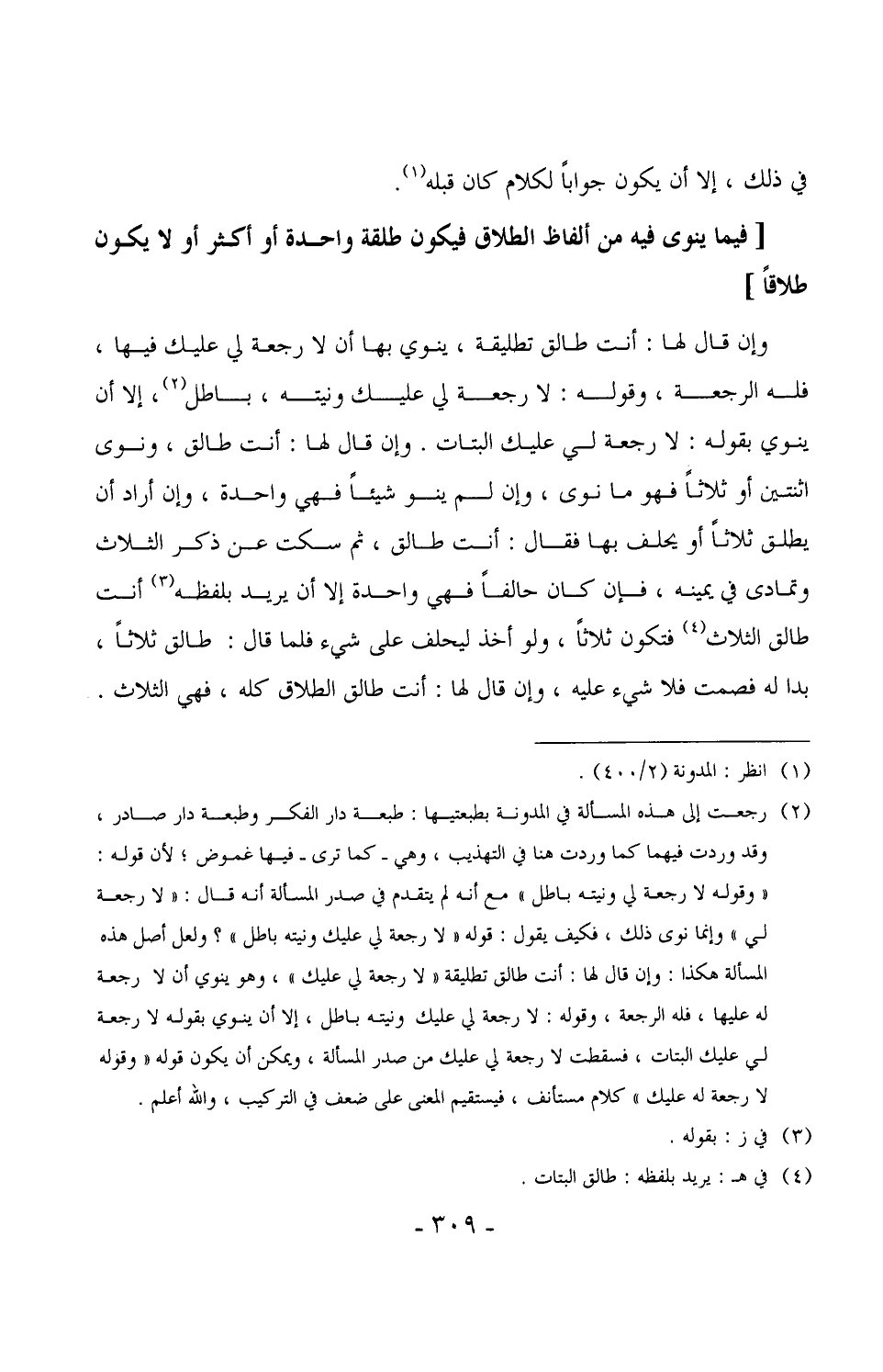 1630 - وإن قال لها: أنت طالق تطليقة، ينوي بها أن لا رجعة لي عليك فيها، فله الرجعة، وقوله: لا رجعة لي عليك ونيته، باطل، إلا أن ينوي بقوله: لا رجعة لي عليك البتات. وإن قال لها: أنت طالق، ونوى اثنتين أو ثلاثاً فهو ما نوى، وإن لم ينو شيئاً فهي واحدة، وإن أراد أن يطلق ثلاثاً أو يحلف بها فقال: أنت طالق، ثم سكت عن ذكر الثلاث وتمادى في يمينه، فإن كان حالفاً فهي واحدة إلا أن يريد بلفظه أنت طالق الثلاث فتكون ثلاثاً، ولو أخذ ليحلف على شيء فلما قال: طالق ثلاثاً، بدا له فصمت فلا شيء عليه، وإن قال لها: أنت طالق الطلاق كله، فهي الثلاث.