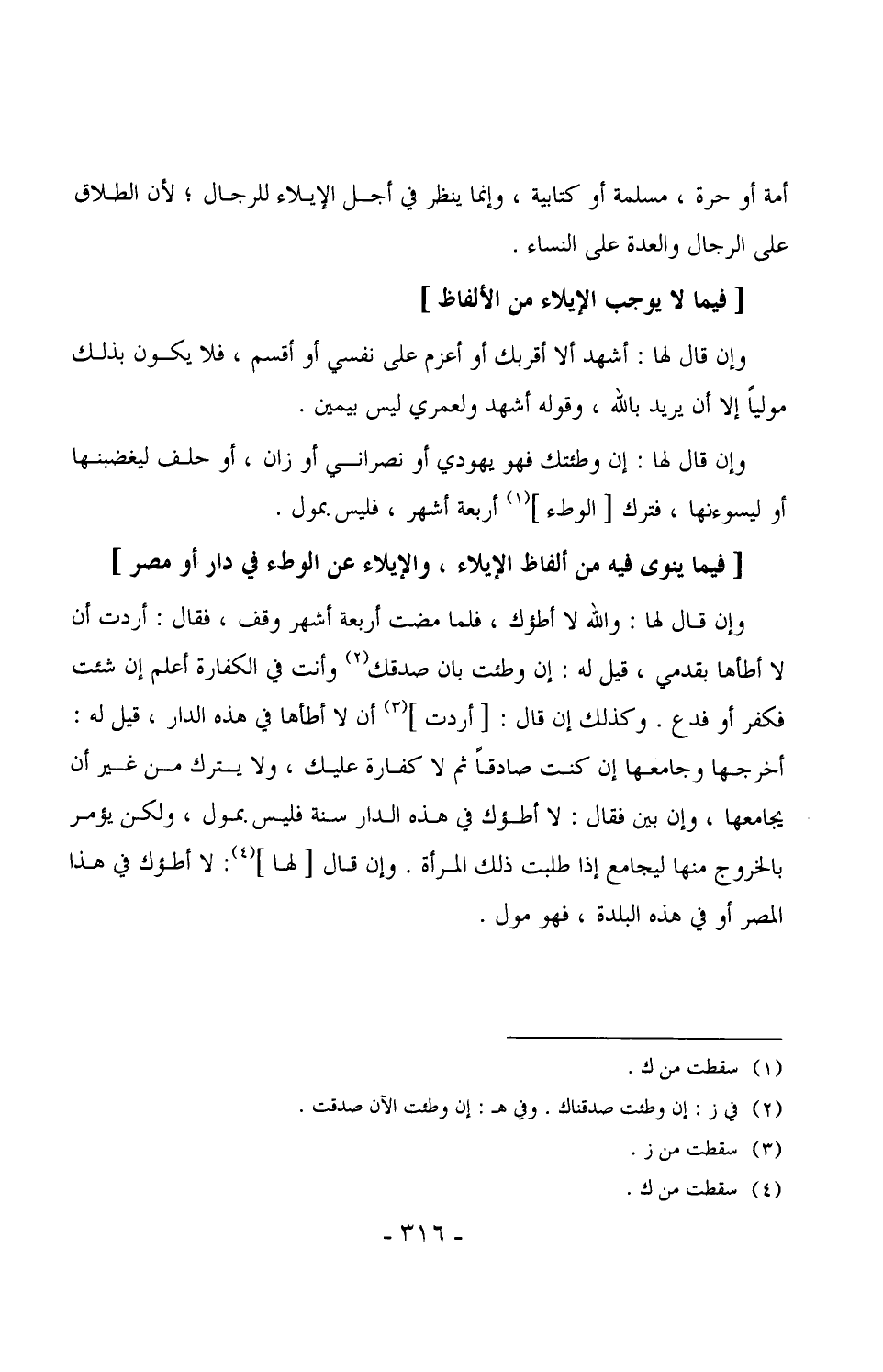 1637 - وإن قال لها: والله لا أطؤك، فلما مضت أربعة أشهر وقف، فقال: أردت أن لا أطأها بقدمي، قيل له: إن وطئت بان صدقك وأنت في الكفارة أعلم إن شئت فكفر أو فدع. وكذلك إن قال: [أردت] أن لا أطأها في هذه الدار، قيل له: أخرجها وجامعها إن كنت صادقاً ثم لا كفارة عليك، ولا يترك من غير أن يجامعها، وإن بين فقال: لا أطؤك في هذه الدار سنة فليس بمول، ولكن يؤمر بالخروج منها ليجامع إذا طلبت ذلك المرأة. وإن قال [لها] : لا أطؤك في هذا المصر أو في هذه البلدة، فهو مول.