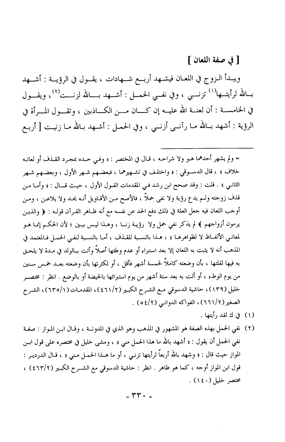 1664 - ويبدأ الزوج في اللعان فيشهد أربع شهادات، يقول في الرؤية: أشهد بالله لرأيتها تزني، وفي نفي الحمل: أشهد بالله لزنت، ويقول في الخامسة: أن لعنة الله عليه إن كان من الكاذبين، وتقول المرأة في الرؤية: أشهد بالله ما رآني أزني، وفي الحمل: أشهد بالله ما زنيت [أربع