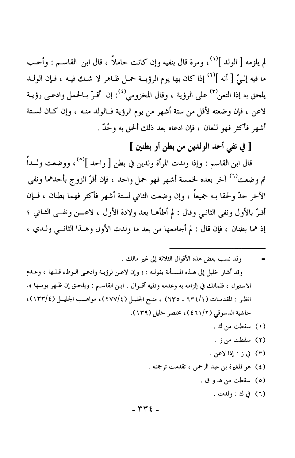 1672 - قال ابن القاسم: وإذا ولدت المرأة ولدين في بطن [واحد] ، ووضعت ولداً ثم وضعت آخر بعده لخمسة أشهر فهو حمل واحد، فإن أقرّ الزوج بأحدهما ونفى الآخر حدّ ولحقا به جميعاً، وإن وضعت الثاني لستة أشهر فأكثر فهما بطنان، فإن أقرّ بالأول ونفى الثاني وقال: لم أطأها بعد ولادة الأول، لاعن ونفى الثاني، إذ هما بطنان، فإن قال: لم أجامعها من بعد ما ولدت الأول وهذا الثاني ولدي،