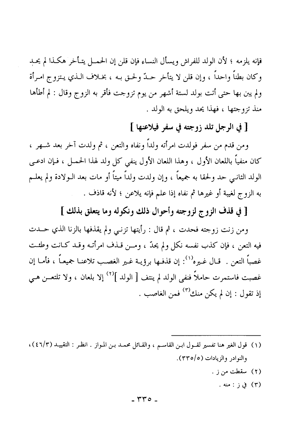 1674 - ومن زنت زوجته فحدت، ثم قال: رأيتها تزني ولم يقذفها بالزنا الذي حدت فيه التعن، فإن كذب نفسه نكل ولم يحد، ومن قذف امرأته وقد كانت وطئت غصباً التعن. قال غيره: إن قذفها برؤية غير الغصب تلاعنا جميعاً، فأما إن غصبت فاستمرت حاملاً فنفى الولد لم ينتف [الولد] إلا بلعان، ولا تلتعن هي إذ تقول: إن لم يكن منك فمن الغاصب.