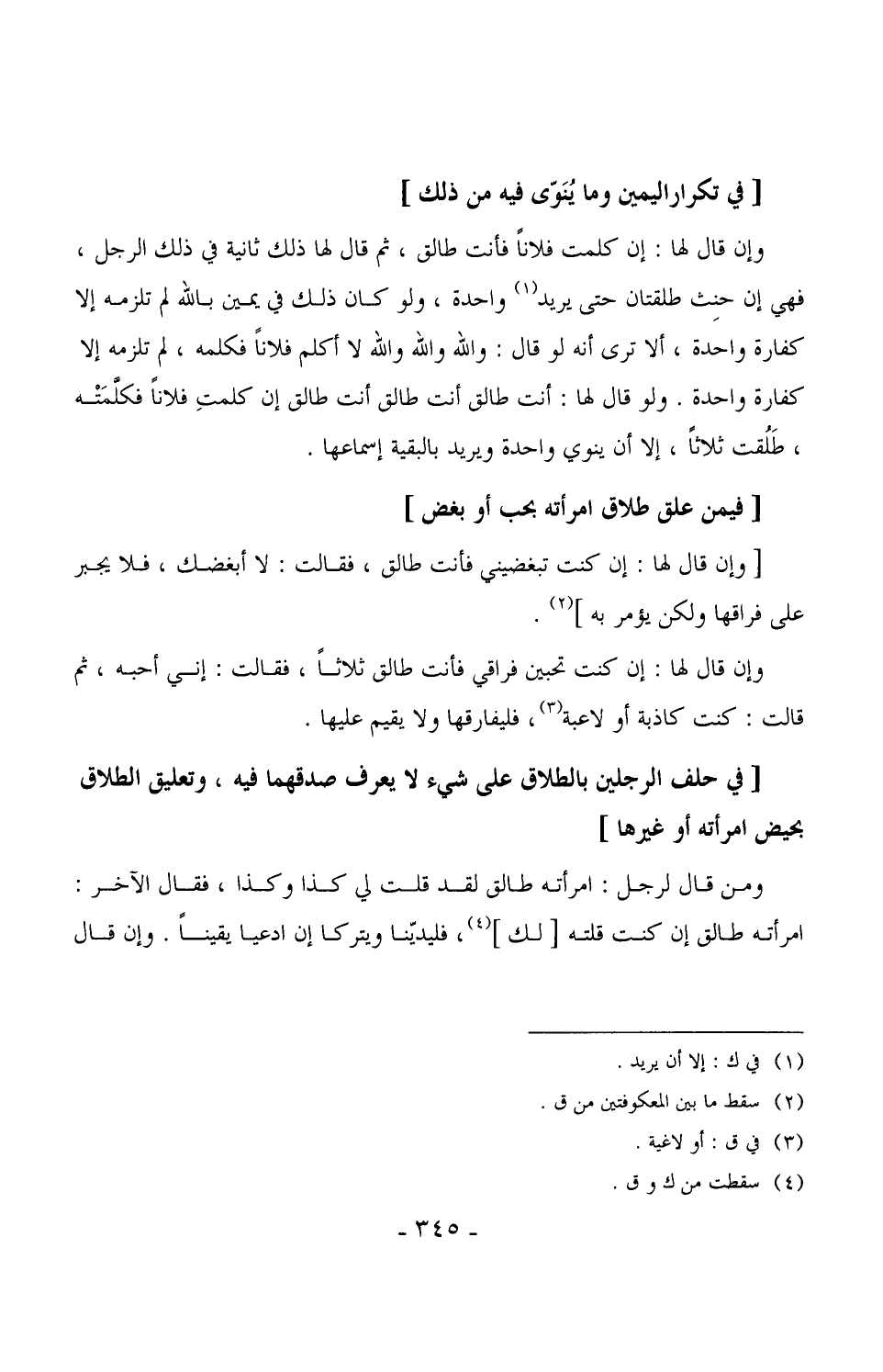 1691 - وإن قال لها: إن كلمت فلاناً فأنت طالق، ثم قال لها ذلك ثانية في ذلك الرجل، فهي إن حنث طلقتان حتى يريد واحدة، ولو كان ذلك في يمين بالله لم تلزمه إلا كفارة واحدة، ألا ترى أنه لو قال: والله والله والله لا أكلم فلاناً فكلمه، لم تلزمه إلا كفارة واحدة. ولو قال لها: أنت طالق أنت طالق أنت طالق إن كلمت فلاناً فكلمته، طلقت ثلاثاً، إلا أن ينوي واحدة ويريد بالبقية إسماعها.