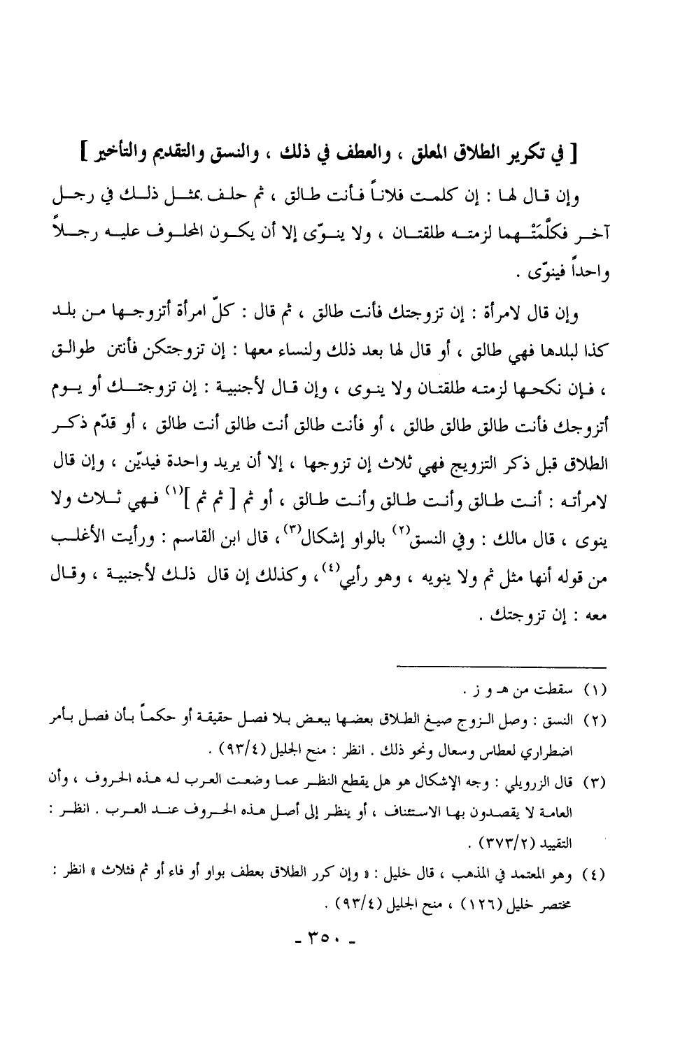 1706 - وإن قال لامرأة: إن تزوجتك فأنت طالق، ثم قال: كل امرأة أتزوجها من بلد كذا لبلدها فهي طالق، أو قال لها بعد ذلك ولنساء معها: إن تزوجتكن فأنتن طوالق، فإن نكحها لزمته طلقتان ولا ينوى، وإن قال لأجنبية: إن تزوجتك أو يوم أتزوجك فأنت طالق طالق طالق، أو فأنت طالق أنت طالق أنت طالق، أو قدّم ذكر الطلاق قبل ذكر التزويج فهي ثلاث إن تزوجها، إلا أن يريد واحدة فيديّن، وإن قال لامرأته: أنت طالق وأنت طالق وأنت طالق، أو ثم [ثم ثم] فهي ثلاث ولا ينوى، قال مالك: وفي النسق بالواو إشكال، قال ابن القاسم: ورأيت الأغلب من قوله أنها مثل ثم ولا ينويه، وهو رأيي، وكذلك إن قال ذلك لأجنبية، وقال معه: إن تزوجتك.