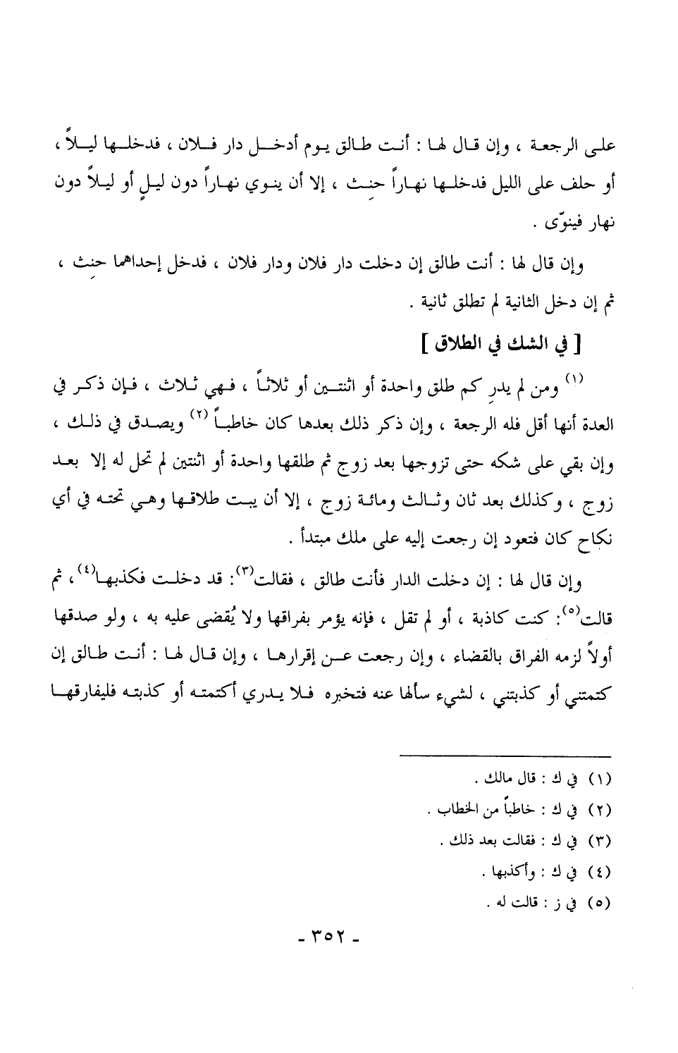 1709 - ومن لم يدر كم طلق واحدة أو اثنتين أو ثلاثاً، فهي ثلاث، فإن ذكر في العدة أنها أقل فله الرجعة، وإن ذكر ذلك بعدها كان خاطباً ويصدق في ذلك، وإن بقي على شكه حتى تزوجها بعد زوج ثم طلقها واحدة أو اثنتين لم تحل له إلا بعد زوج، وكذلك بعد ثان وثالث ومائة زوج، إلا أن يبت طلاقها وهي تحته في أي نكاح كان فتعود إن رجعت إليه على ملك مبتدأ. (¬1)