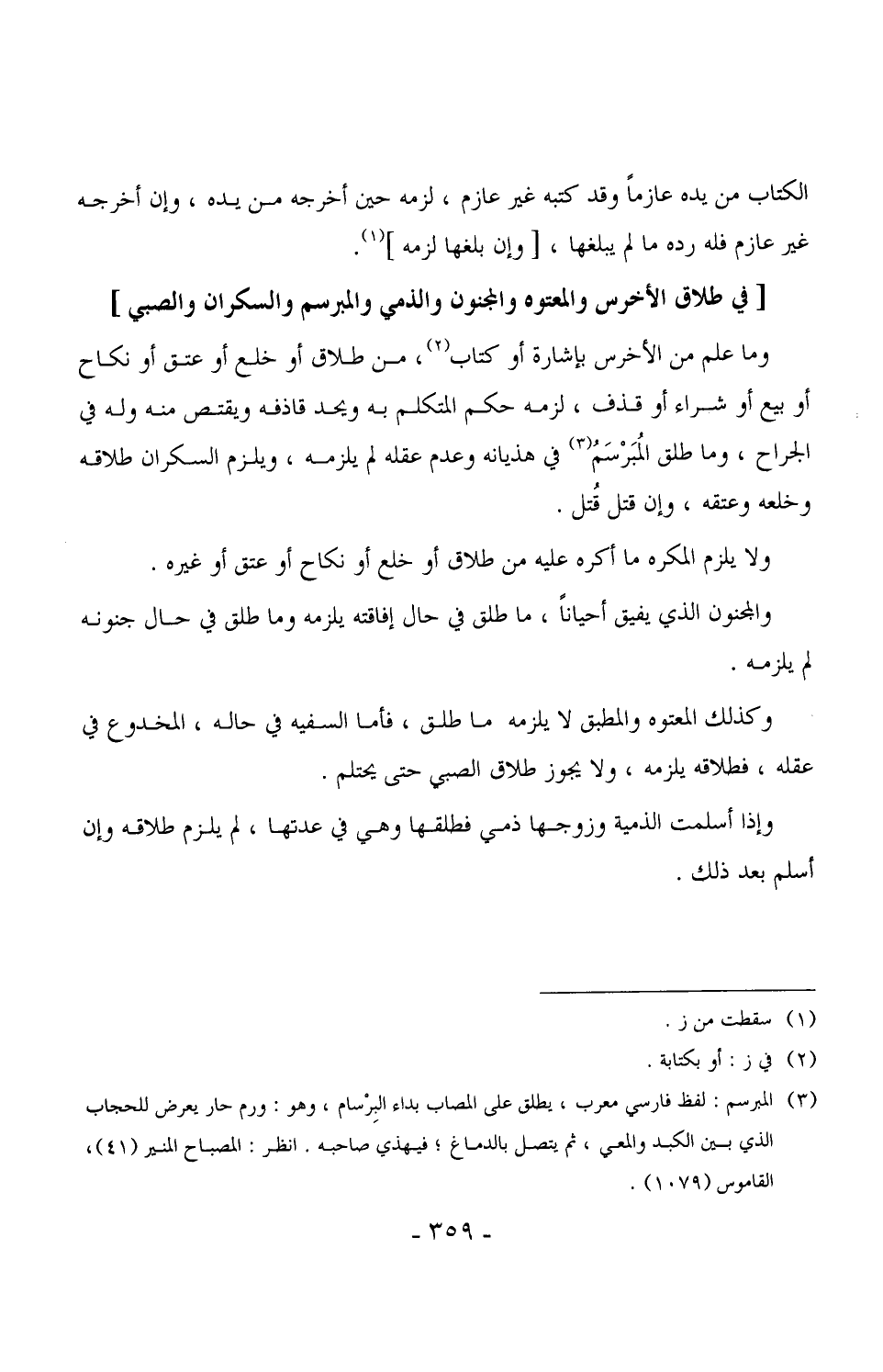 1727 - وما علم من الأخرس بإشارة أو كتاب، من طلاق أو خلع أو عتق أو نكاح أو بيع أو شراء أو قذف، لزمه حكم المتكلم به ويحد قاذفه ويقتص منه وله في الجراح، وما طلق المُبَرْسم في هذيانه وعدم عقله لم يلزمه، ويلزم السكران طلاقه وخلعه وعتقه، وإن قتل قُتل.