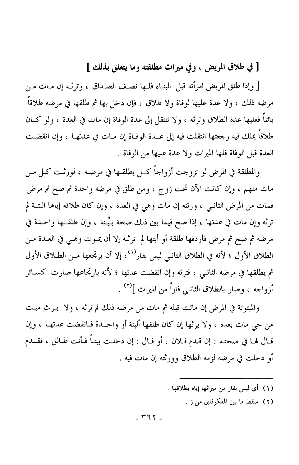 1733 -[وإذا طلق المريض امرأته قبل البناء فلها نصف الصداق، وترثه إن مات من مرضه ذلك، ولا عدة عليها لوفاة ولا طلاق، فإن دخل بها ثم طلقها في مرضه طلاقاً بائناً فعليه عدة الطلاق وترثه، ولا تنتقل إلى عدة الوفاة إن مات في العدة، ولو كان طلاقاً يملك فيه رجعتها انتقلت فيه إلى عدة الوفاة إن مات في عدتها، وإن انقضت العدة قبل الوفاة فلها الميراث ولا عدة عليها من الوفاة. (¬1)