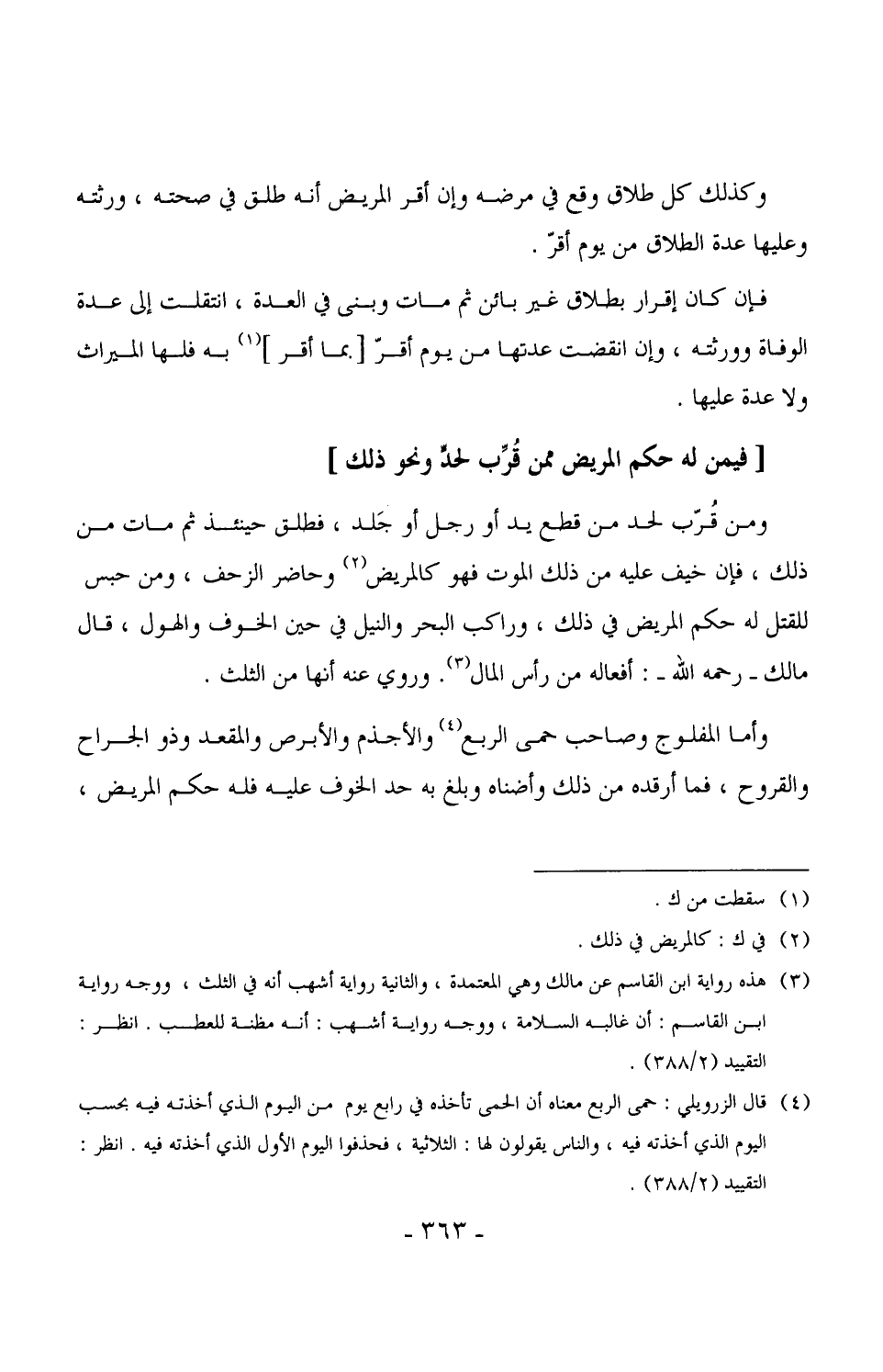 1736 - ومن قُرّب لحد من قطع يد أو رجل أو جَلد، فطلق حينئذ ثم مات من ذلك، فإن خيف عليه من ذلك الموت فهو كالمريض وحاضر الزحف، ومن حبس للقتل له حكم المريض في ذلك، وراكب البحر والنيل في حين الخوف والهول، قال مالك - رحمه الله -: أفعاله من رأس المال، وروي عنه أنها من الثلث.