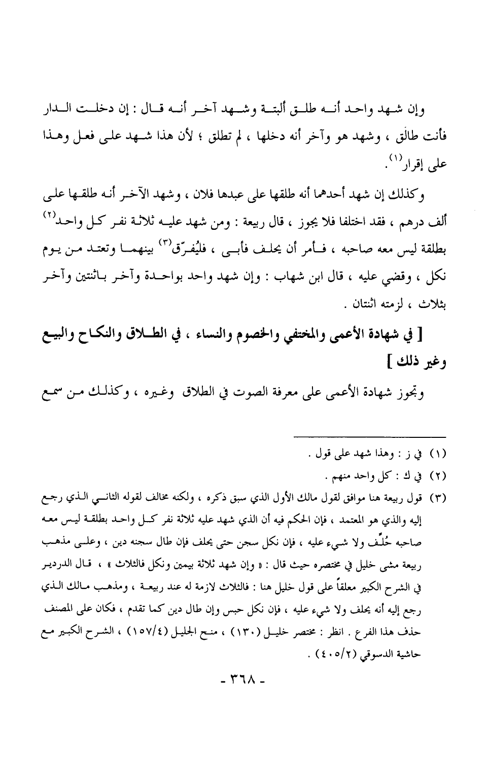 1746 - وكذلك إن شهد أحدهما أنه طلقها على عبدها فلان، وشهد الآخر أنه طلقها على ألف درهم، فقد اختلفا فلا يجوز، قال ربيعة: ومن شهد عليه ثلاثة نفر كل واحد بطلقة ليس معه صاحبه، فأمر أن يحلف فأبى، فليُفرّق بينهما وتعتد من يوم نكل، وقضي عليه، قال ابن شهاب: وإن شهد واحد بواحدة وآخر باثنتين وآخر بثلاث، لزمته اثنتان.