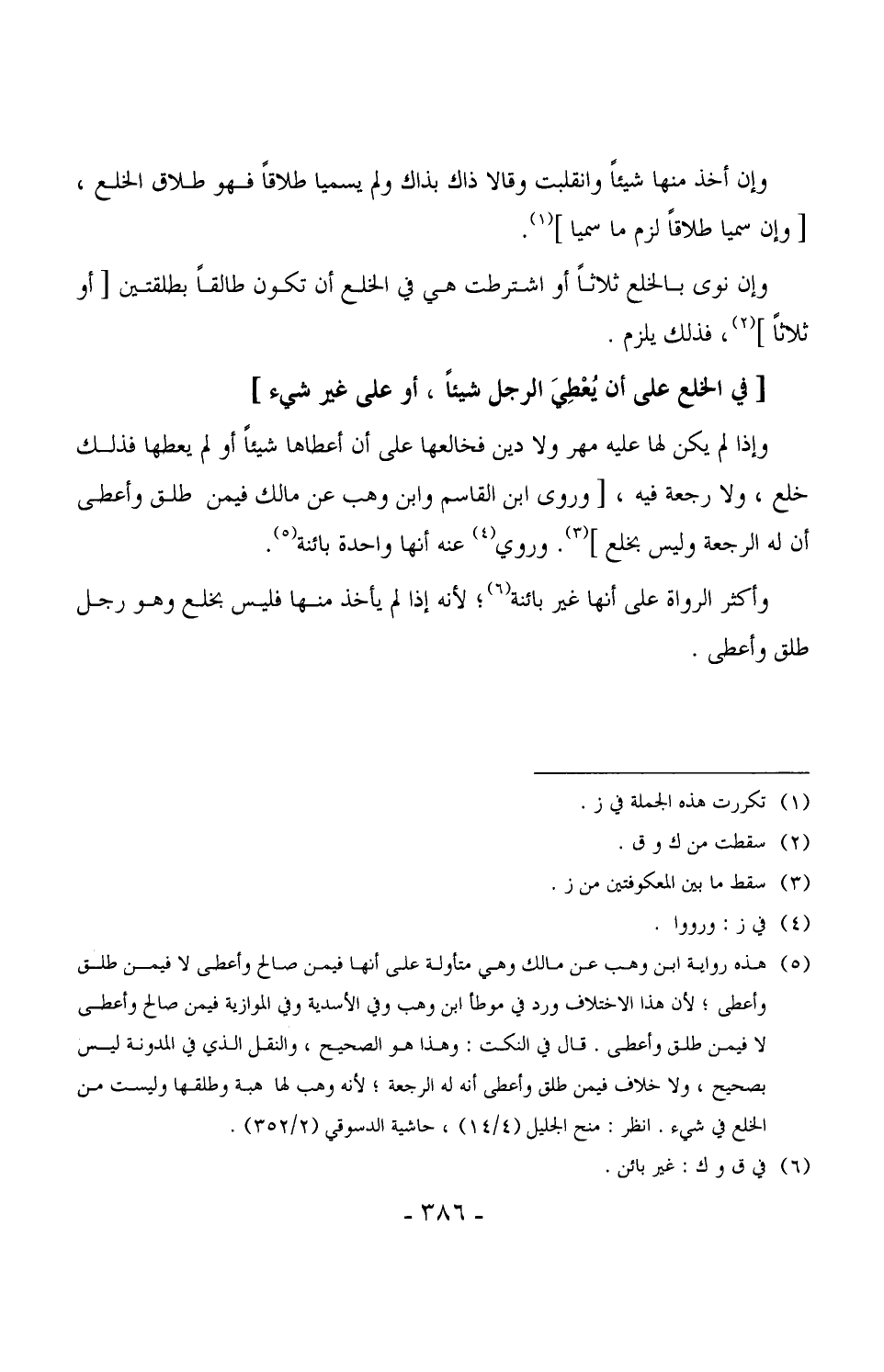 1790 - وإن نوى بالخلع ثلاثاً أو اشترطت هي في الخلع أن تكون طالقاً بطلقتين [أو ثلاثاً] ، فذلك يلزم.