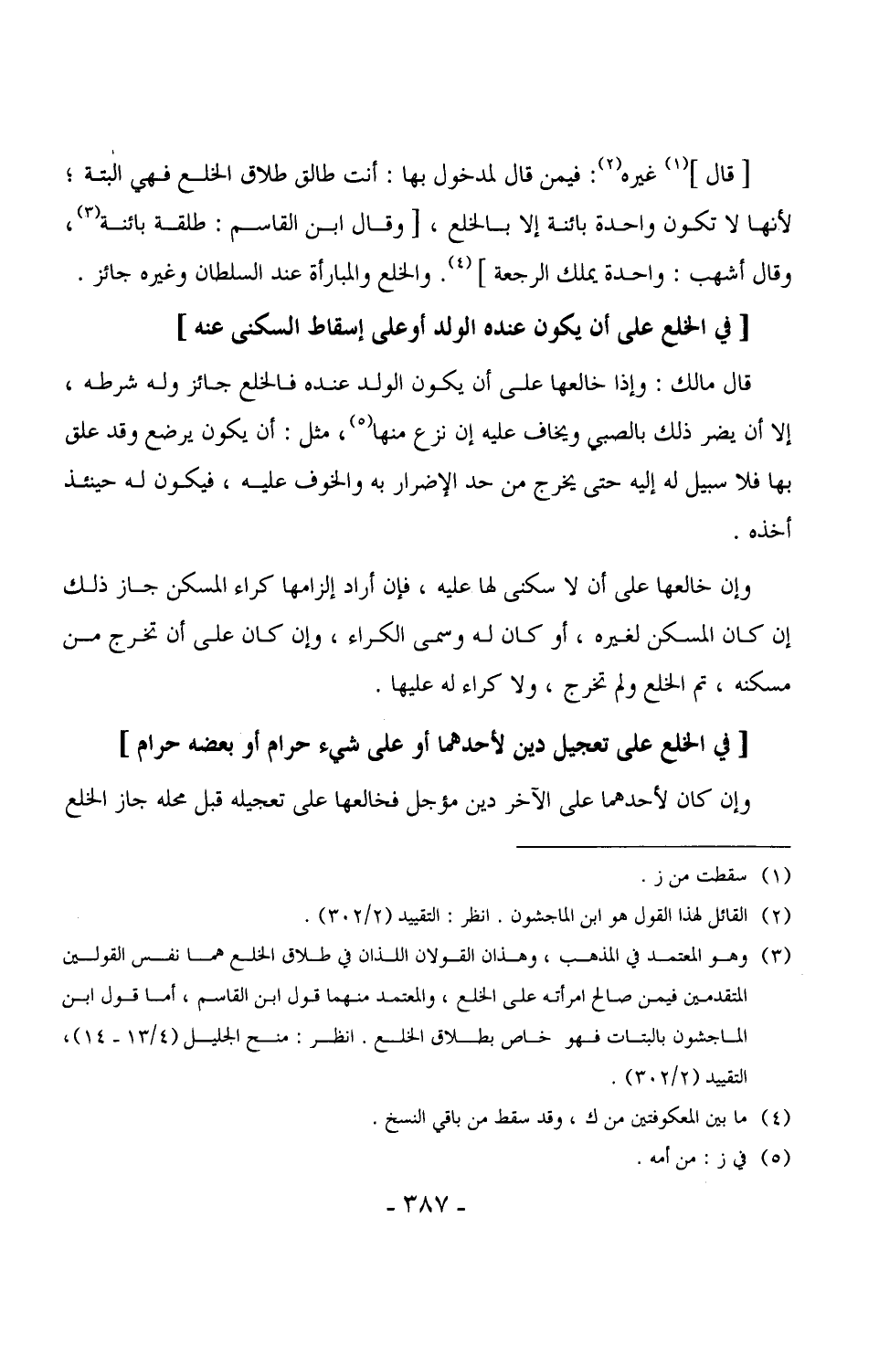 1793 - وإن خالعها على أن لا سكنى لها عليه، فإن أراد إلزامها كراء المسكن جاز ذلك إن كان المسكن لغيره، أو كان له وسمى الكراء، وإن كان على أن تخرج من مسكنه، تم الخلع ولم تخرج، ولا كراء له عليها.