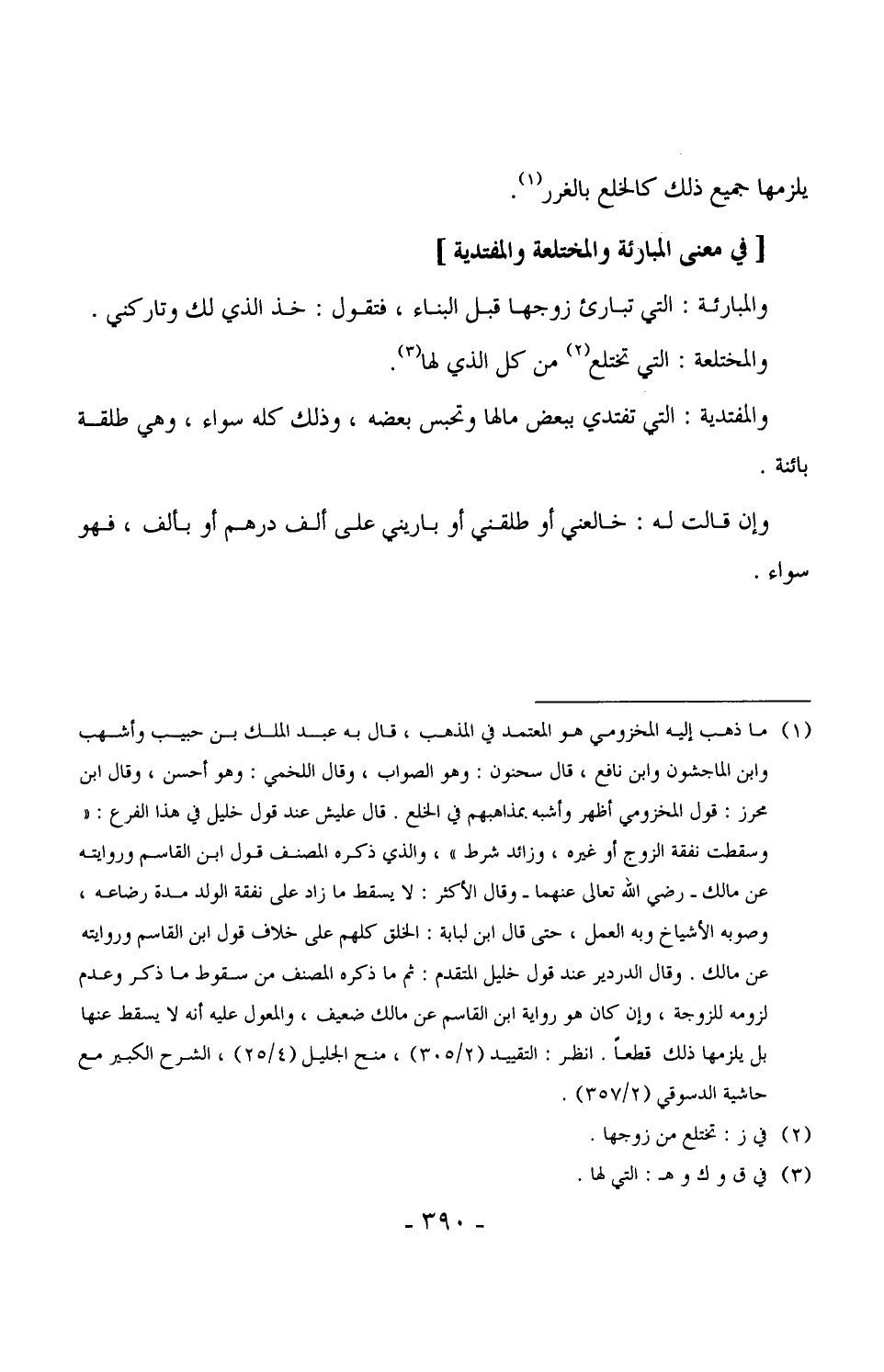 والمفتدية: التي تفتدي ببعض مالها وتحبس بعضه، وذلك كله سواء، وهي طلقة بائنة. (¬1)
