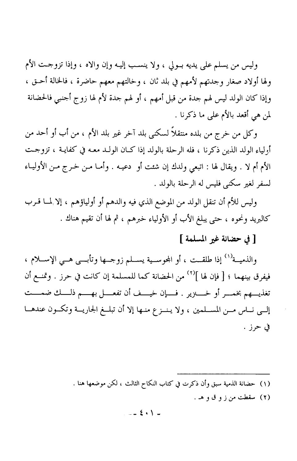 1820 - وكل من خرج من بلده متنقلاً لسكنى بلد آخر غير بلد الأم، من أب أو أحد من أولياء الولد الذين ذكرنا، فله الحلة بالولد إذا كان الولد معه في كفاية، تزوجت الأم أم لا. ويقال لها: اتبعي ولدك إن شئت أو دعيه. وأما من خرج من الأولياء لسفر لغير سكنى فليس له الرحلة بالولد.