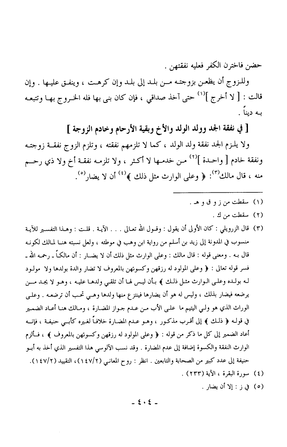 1833 - ولا يلزم الجد نفقة ولد الولد، كما لا تلزمهم نفقته، وتلزم الزوج نفقة زوجته ونفقة خادم [واحدة] من خدمها لا أكثر، ولا تلزمه نفقة أخ ولا ذي رحم منه، قال مالك: ×وَعَلَى الْوَارِثِ مِثْلُ ذَلِكَ% أن لا يضار.