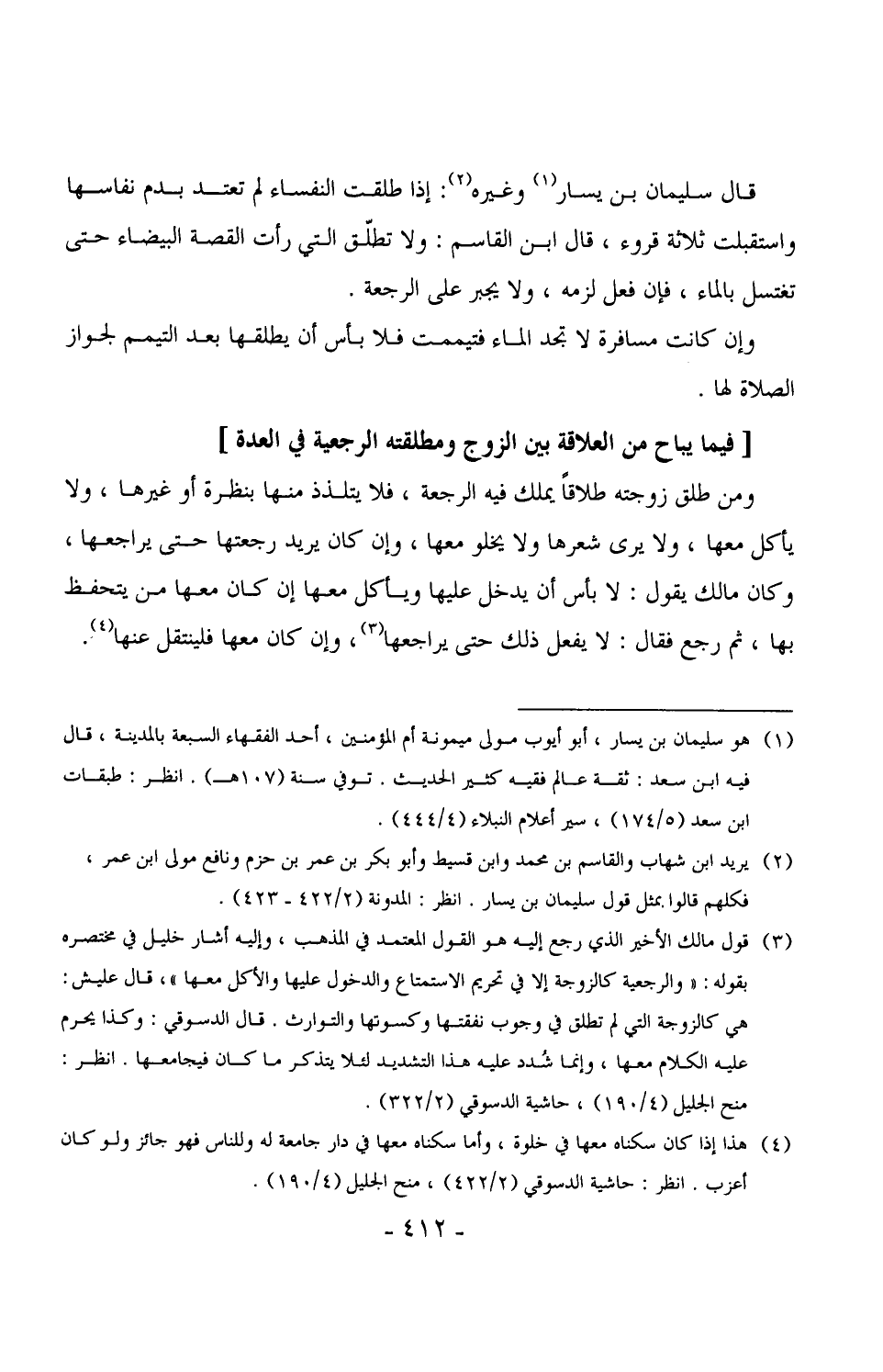 1840 - ومن طلق زوجته طلاقاً يملك فيه الرجعة، فلا يتلذذ منها بنظرة أو غيرها، ولا يأكل معها، ولا يرى شعرها ولا يخلو معها، وإن كان يريد رجعتها حتى يراجعها، وكان مالك يقول: لا باس أن يدخل عليها ويأكل معها إن كان معها من يتحفظ بها، ثم رجع فقال: لا يفعل ذلك حتى يراجعها، وإن كان معها فلينتقل عنها.
