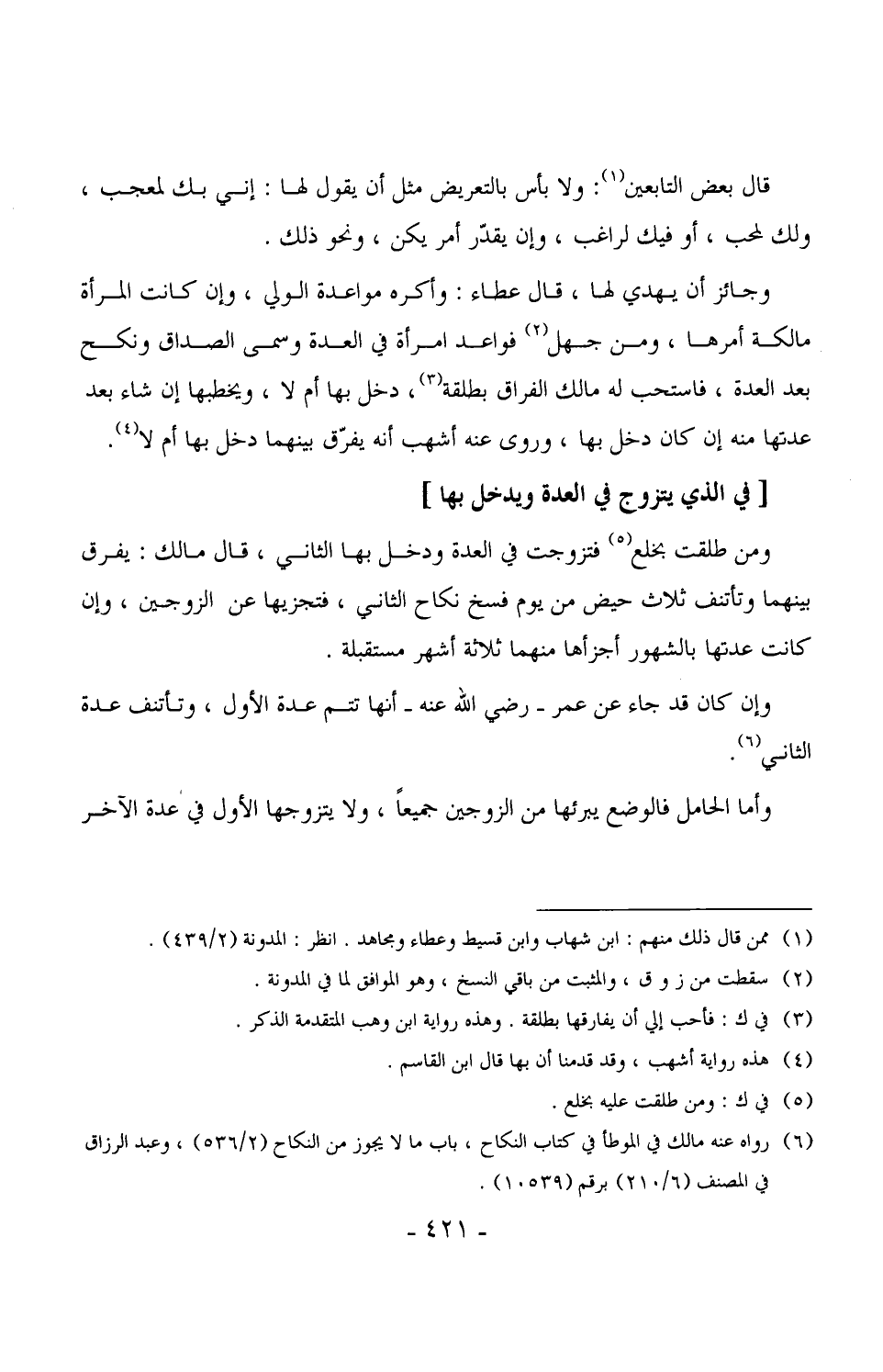 وجائز أن يهدي لها، قال عطاء: وأكره مواعدة الولي، وغن كانت المرأة مالكة أمرها، ومن جهل فواعد امرأة في العدة وسمى الصداق ونكح بعد العدة، فاستحب له مالك الفراق بطلقة، دخل بها أم لا، ويخطبها إن شاء بعد عدتها منه إن كان دخل بها، وروى عنه أشهب انه يفرّق بينهما دخل بها أم لا.