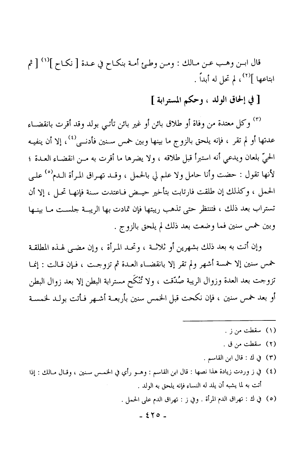 1861 - وكل معتدة من وفاة أو طلاق بائن أو غير بائن تأتي بولد وقد أقرت بانقضاء عدتها أو لم تقر، فإنه يلحق بالزوج ما بينها وبين خمس سنين فأدنى، إلا أن ينفيه الحي بلعان ويدعي أنه استبرأ قبل طلاقه، ولا يضرها ما أقرت به من انقضاء العدة، لأنها تقول: حضت وأنا حامل ولا علم لي بالحمل، وقد تهراق المرأة الدم على الحمل، وكذلك إن طلقت فارتابت بتأخير حيض فاعتدت سنة فإنها تحل، إلا أن تستراب بعد ذلك، فتنتظر حتى تذهب ريبتها فإن تمادت بها الريبة جلست ما بينها وبين خمس سنين فما وضعت بعد ذلك لم يلحق بالزوج.