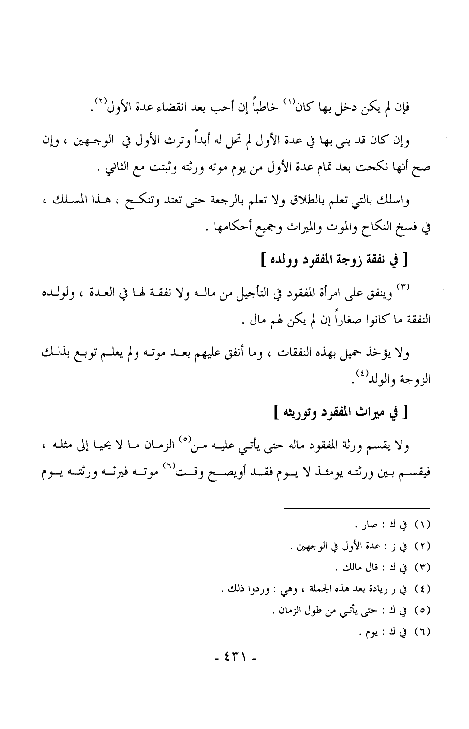 1871 - ولا يقسم ورثة المفقود ماله حتى يأتي عليه من الزمان ما لا يحيا إلى مثله، فيقسم بين ورثته يومئذ لا يوم فقد أو يصح وقت موته فيرثه ورثته يوم