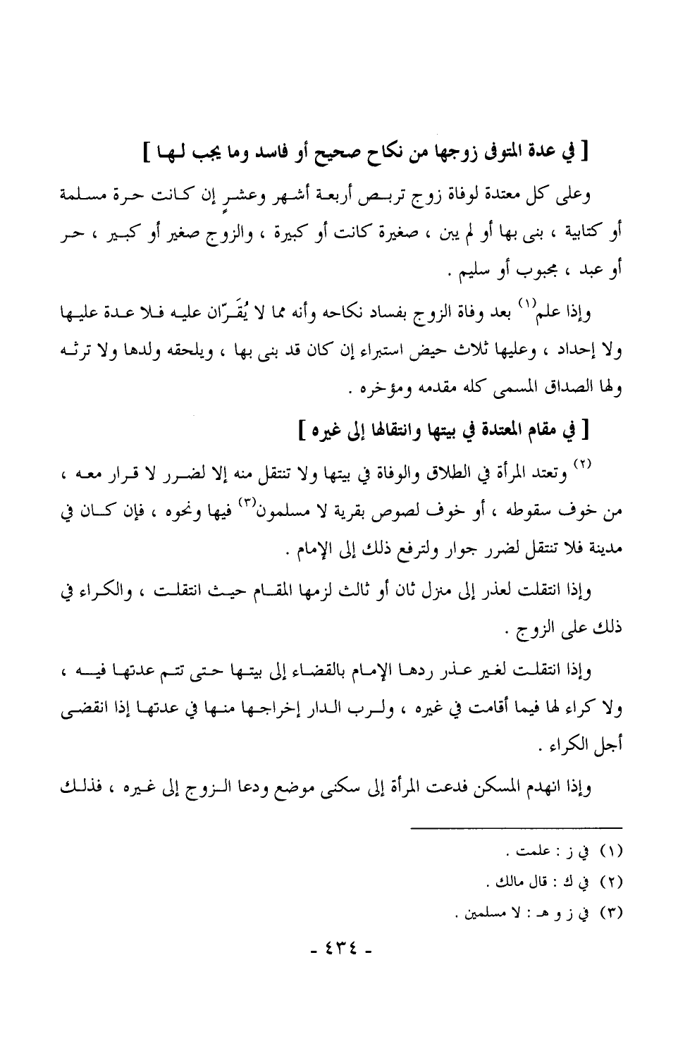 1878 - وعلى كل معتدة لوفاة زوج تربص أربعة أشهر وعشر إن كانت حرة مسلمة أو كتابية، بنى بها أو لم يبن، صغيرة كانت أو كبيرة، والزوج صغير أو كبير، حر أو عبد، مجبوب أو سليم.