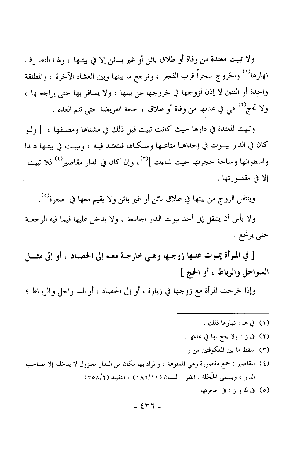 1885 - ولا تبيت معتدة من وفاة أو طلاق بائن أو غير بائن إلا في بيتها، ولها التصرف نهارها والخروج سحراً قرب الفجر، وترجع ما بينها وبين العشاء الآخرة، والمطلقة واحدة أو اثنتين لا إذن لزوجها في خروجها عن بيتها، ولا يسافر بها حتى يراجعها، ولا تحج هي في عدتها من وفاة أو طلاق، حجة الفريضة حتى تتم العدة.