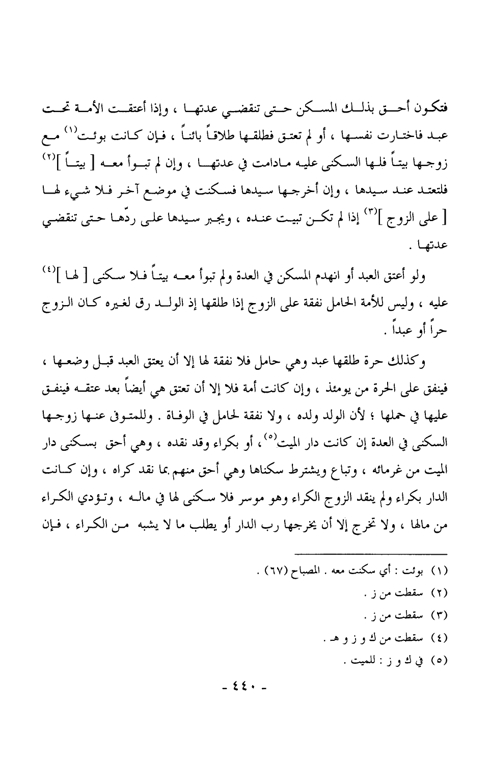 1893 - ولو أعتق العبد أو انهدم المسكن في العدة ولم تبوأ معه بيتاً فلا سكنى [لها] عليه، وليس للأمة الحامل نفقة على الزوج إذا طلقها إذ الولد رق لغيره كان الزوج حراً أو عبداً.