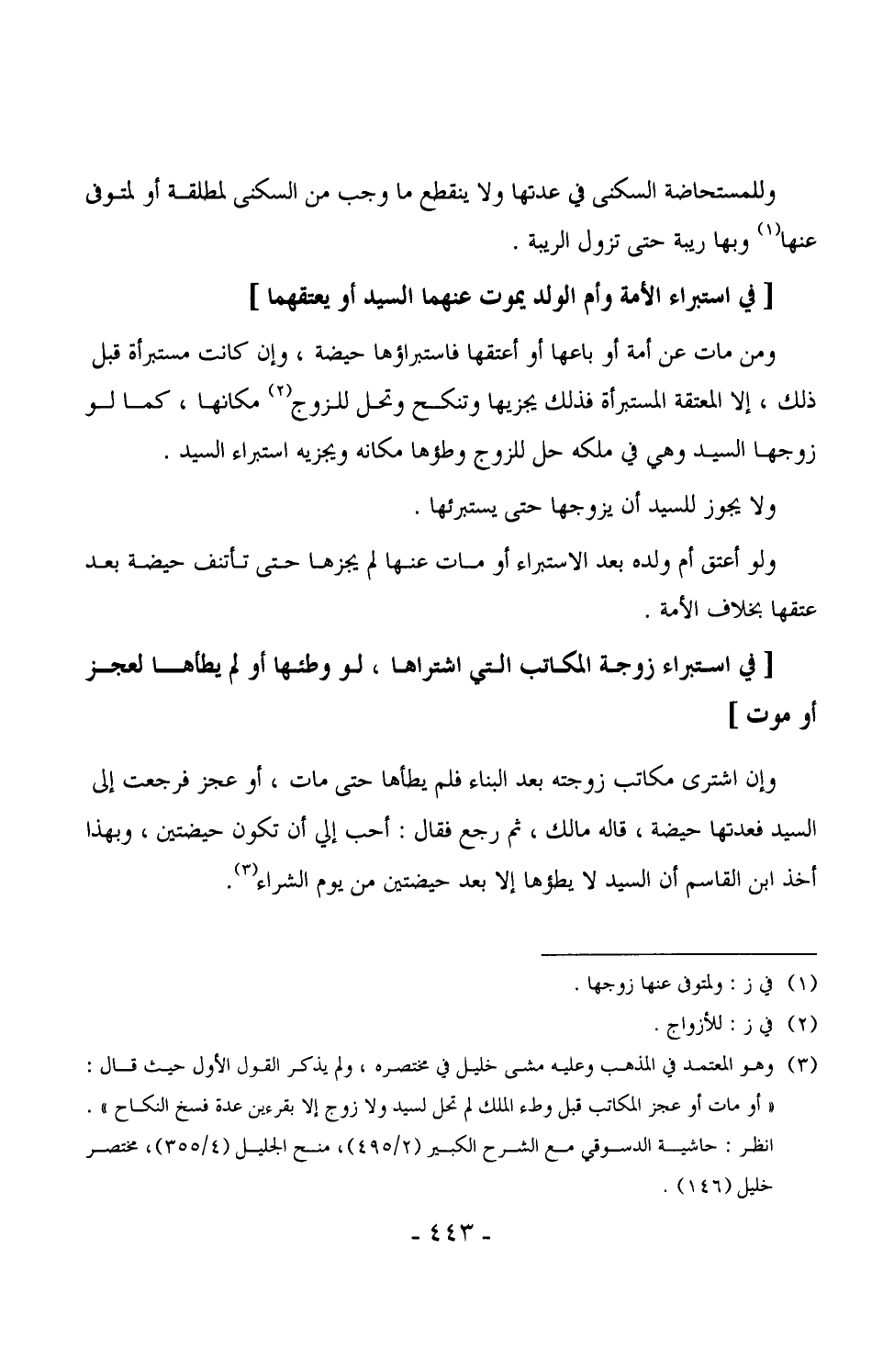 1894 - ومن مات عن أمة أو باعها أو أعتقها فاستبراؤها حيضة، وإن كانت مستبرأة قبل ذلك، إلا المعتقة المستبرأة فذلك يجيزها وتنكح وتحل للزوج مكانها، كما لو زوجها السيد وهي في ملكه حل للزوج وطؤها مكانه ويجزيه استبراء السيد.