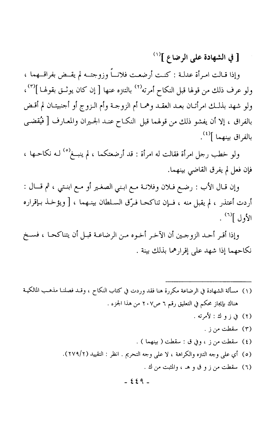 1896 - وإذا قالت امرأة عدلة: كنت أرضعت فلاناً وزوجته لم يقض بفراقهما، ولو عرف ذلك من قولها قبل النكاح أمرته بالتنزه عنها [إن كان يوثق بقولها] ، ولو شهد بذلك امرأتان بعد العقد وهما أم الزوجة وأم الزوج أو أجنبيتان لم أفض بالفراق، إلا أن يفشر ذلك من قولهما قبل النكاح عند الجيران والمعارف [فيُقضى بالفراق بينهما] .