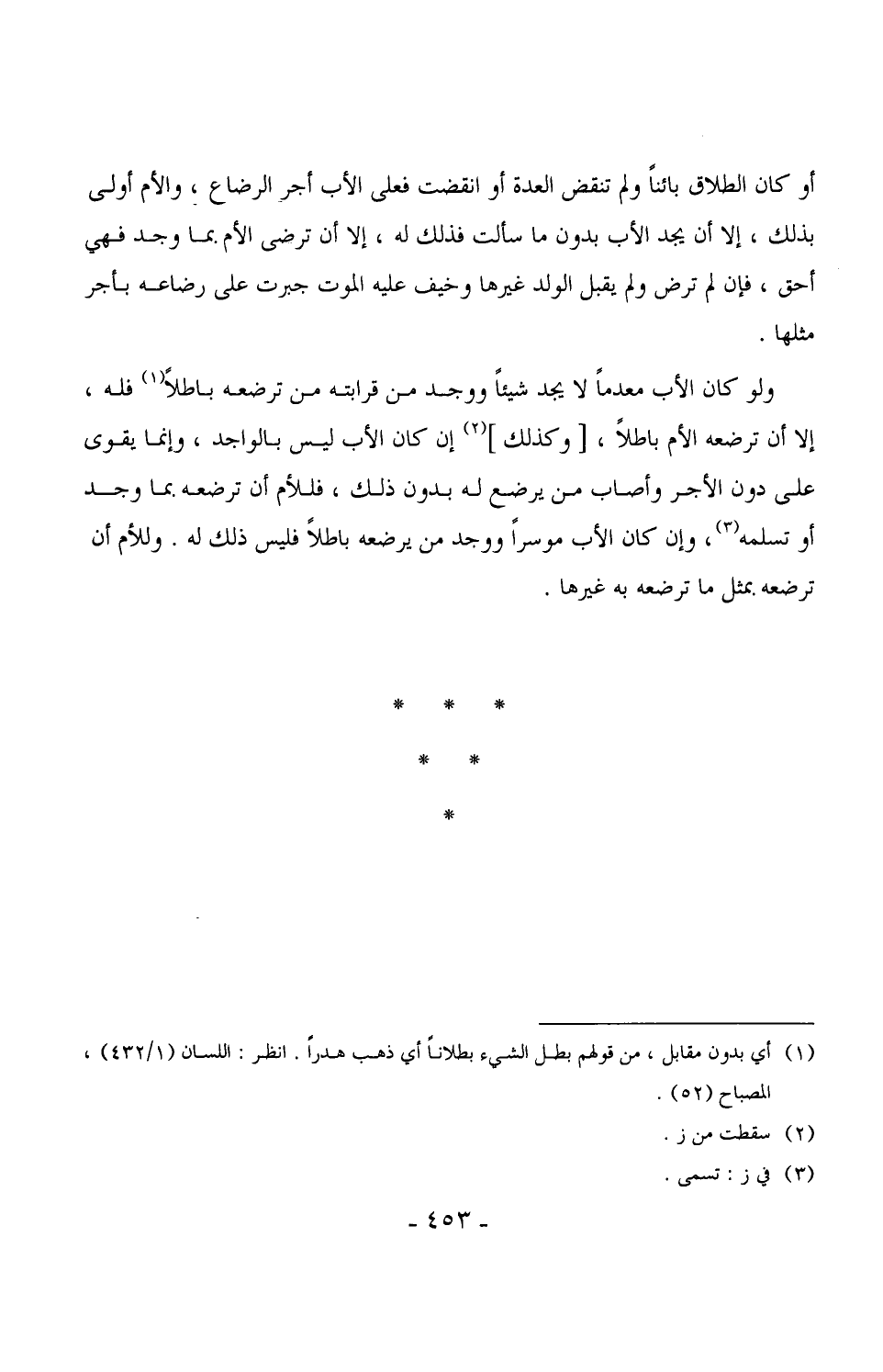 ولو كان الأب معدماً لا يجد شيئاً ووجد من قرابته من ترضعه باطلاً فله، إلا أن ترضعه الأم باطلاً، [وكذلك] إن كان الأب ليس بالواجد، وإنما يقوى على دون الأجر وأصاب من يرضع له بدون ذلك، فللأم أن ترضعه بما وجد أو تسلمه، وإن كان الأب موسراً ووجد من يرضعه باطلاً فليس ذلك له. وللأم أن ترضعه بمثل ما ترضعه به غيرها.