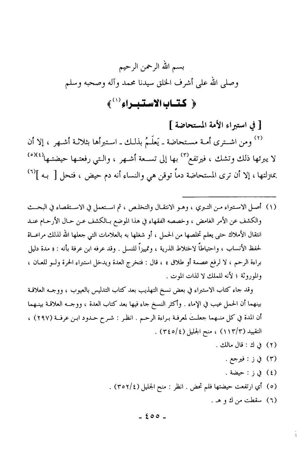 1911 - ومن اشترى أمة مستحاضة - يعلم ذلك - استبرأها بثلاثة أشهر، إلا أن لا يبرئها ذلك وتشك، فيرتفع بها إلى تسعة أشهر، والتي رفعتها حيضتها بمنزلتها، إلا أن ترى المستحاضة دماً توقن هي والنساء أنه دم حيض، فتحل [به]