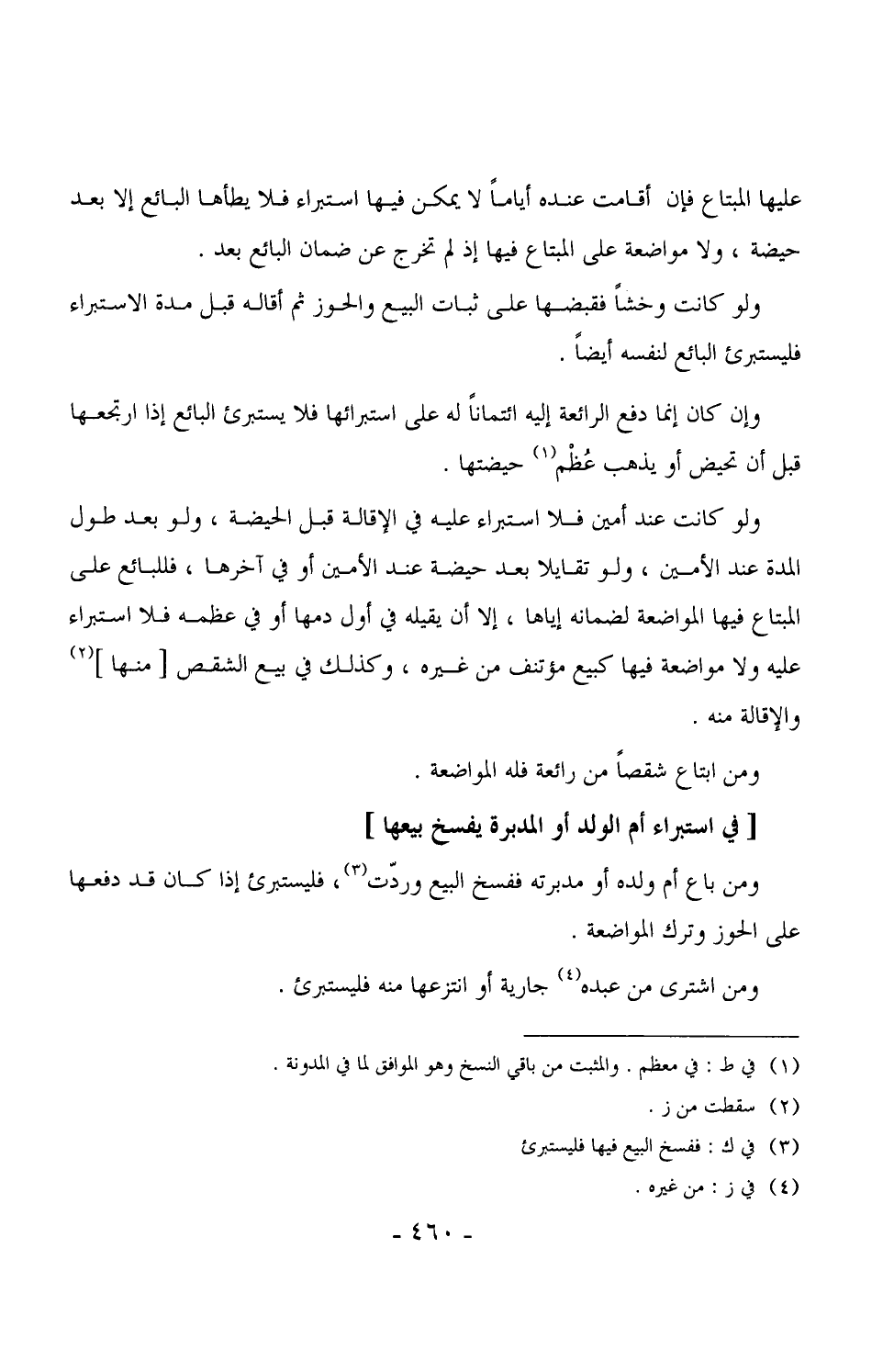 ولو كانت عند أمين فلا استبراء عليه في الإقالة قبل الحيضة، ولو بعد طول المدة عند الأمين، ولو تقابلا بعد حيضة عند الأمين أو في آخرها، فللبائع على المبتاع فيها المواضعة لضمانه إياها، غلا أن يقيله في أول دمها أو في عظمه فلا استبراء عليه ولا مواضعة فيها كبيع مؤتنف من غيره، وكذلك في بيع الشقص [منها] والإقالة منه.
