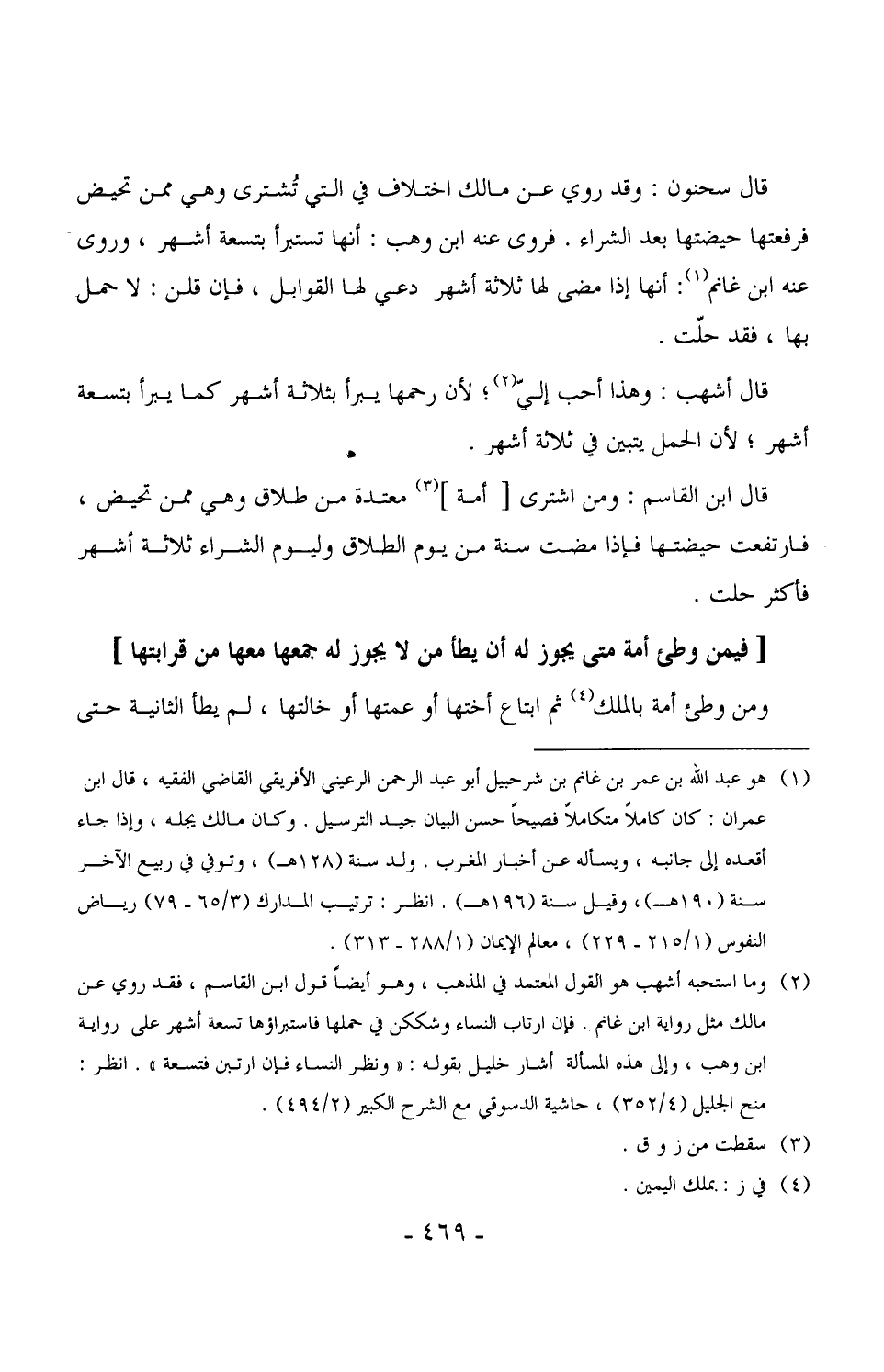قال سحنون: وقد روي عن مالك اختلاف في التي تُشترى وهي ممن تحيض فرفعتها حيضتها بعد الشراء. فروى عنه ابن وهب: أنها تستبرأ بتسعة أشهر، وروى عنه ابن غانم: أنها إذا مضى لها ثلاثة أشهر دعي لها القوابل، فإن قلن: لا حمل بها، فقد حلّت.