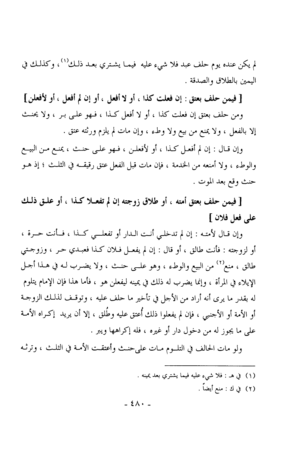 1967 - ومن حلف بعتق إن فعلت كذا، أو لا أفعل كذا، فهو على بر، ولا يحنث إلا بالفعل، ولا يمنع من بيع ولا وطء، وإن مات لم يلزم ورثته عتق.