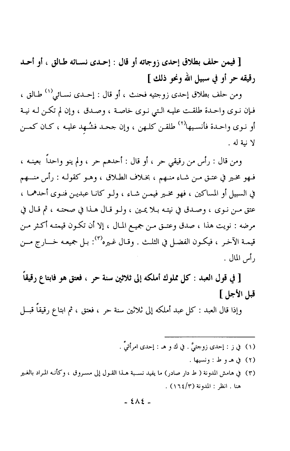 1977 - ومن حلف بطلاق إحدى زوجتيه فحنث، أو قال: إحدى نسائي طالق، فإن نوى واحدة طلقت عليه التي نوى خاصة، وصدق، وإن لم تكن له نية أو نوى واحدة فأنسيها طلقن كلهن، وإن جحد فشُهد عليه، كان كمن لا نية له.