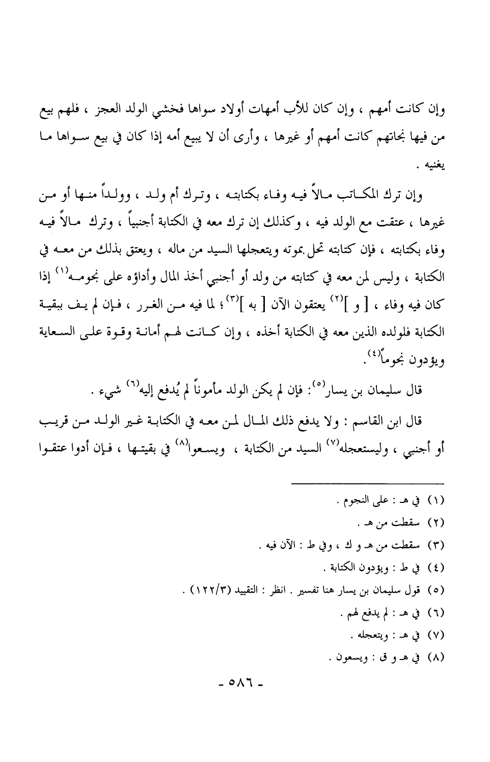 2158 - وإن ترك المكاتب مالاً فيه وفاء بكتابته، وترك أم ولد، وولداً منها أو من غيرها، عتقت مع الولد فيه، وكذلك إن ترك معه في الكتابة أجنبياً، وترك مالاً فيه وفاء بكتابته، فإن كتابته تحل بموته ويتعجلها السيد من ماله، ويعتق بذلك من معه في الكتابة، وليس لمن معه في كتابته من ولد أو أجنبي أخذ المال وأداؤه على نجومه إذا كان فيه وفاء، [و] يعتقون الآن [به] ، لما فيه من الغرر، فإن لم يف ببقية الكتابة فلولده الذين معه في الكتابة أخذه، وإن كانت لهم أمانة وقوة على السعاية ويؤدون نجوماً.